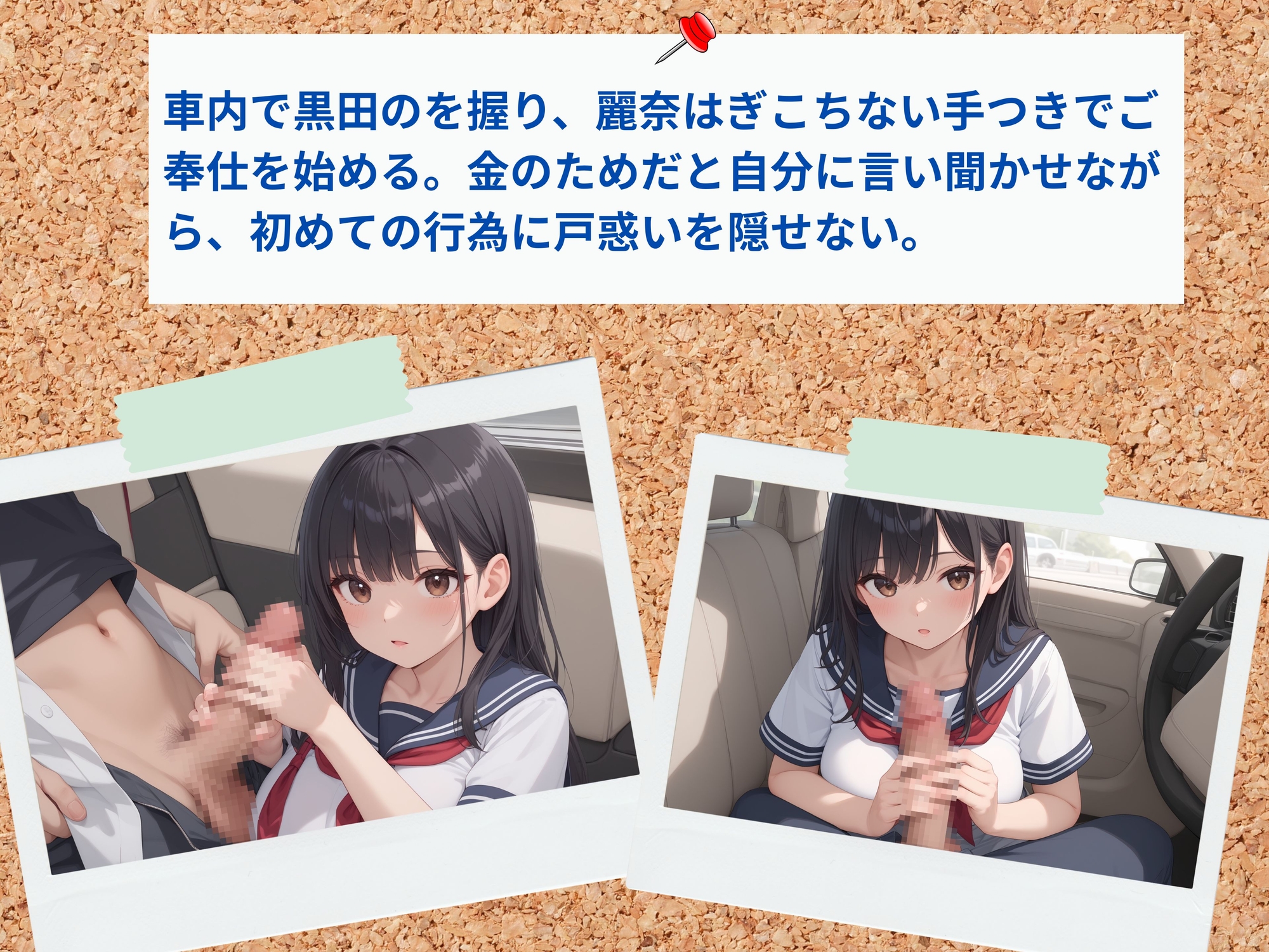 狭い車内で始まったのは、手コキ、フェラ、顔射の洗礼。麗奈は戸惑いながらも、ブランド品を買うためだと自分に言い聞かせる。しかし、その後に待っていたのは、連続中出しセックスだった。