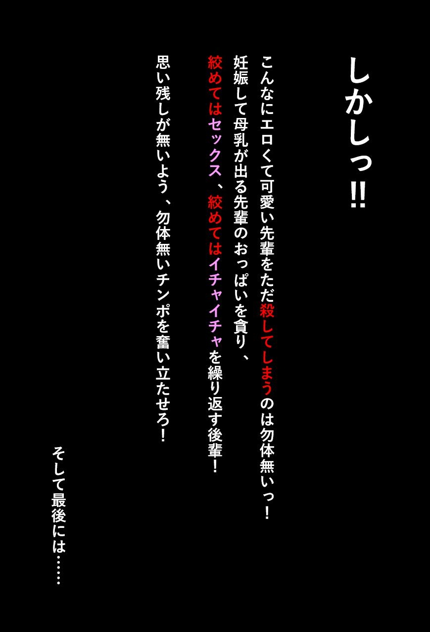 今際SEXをテーマにした作品で、今生のお別れセックスに興じる内容です。ある日突然、大学の先輩から「殺して欲しい」とお願いされた後輩が、先輩の願いを叶える前に色々させてもらうお話です。残酷な描写がありますので、ご注意下さい。
