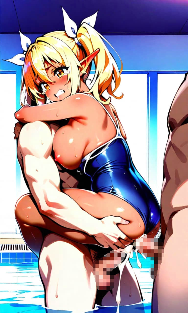 己の癖を詰め込み欲望に従って作成したものです。ダークエルフには人権がない世界観、学校の野郎どもに肉便器にされているイメージ。スクール水着を着た巨乳金髪ツインテールダークエルフちゃんが無理矢理エロいことをされています。