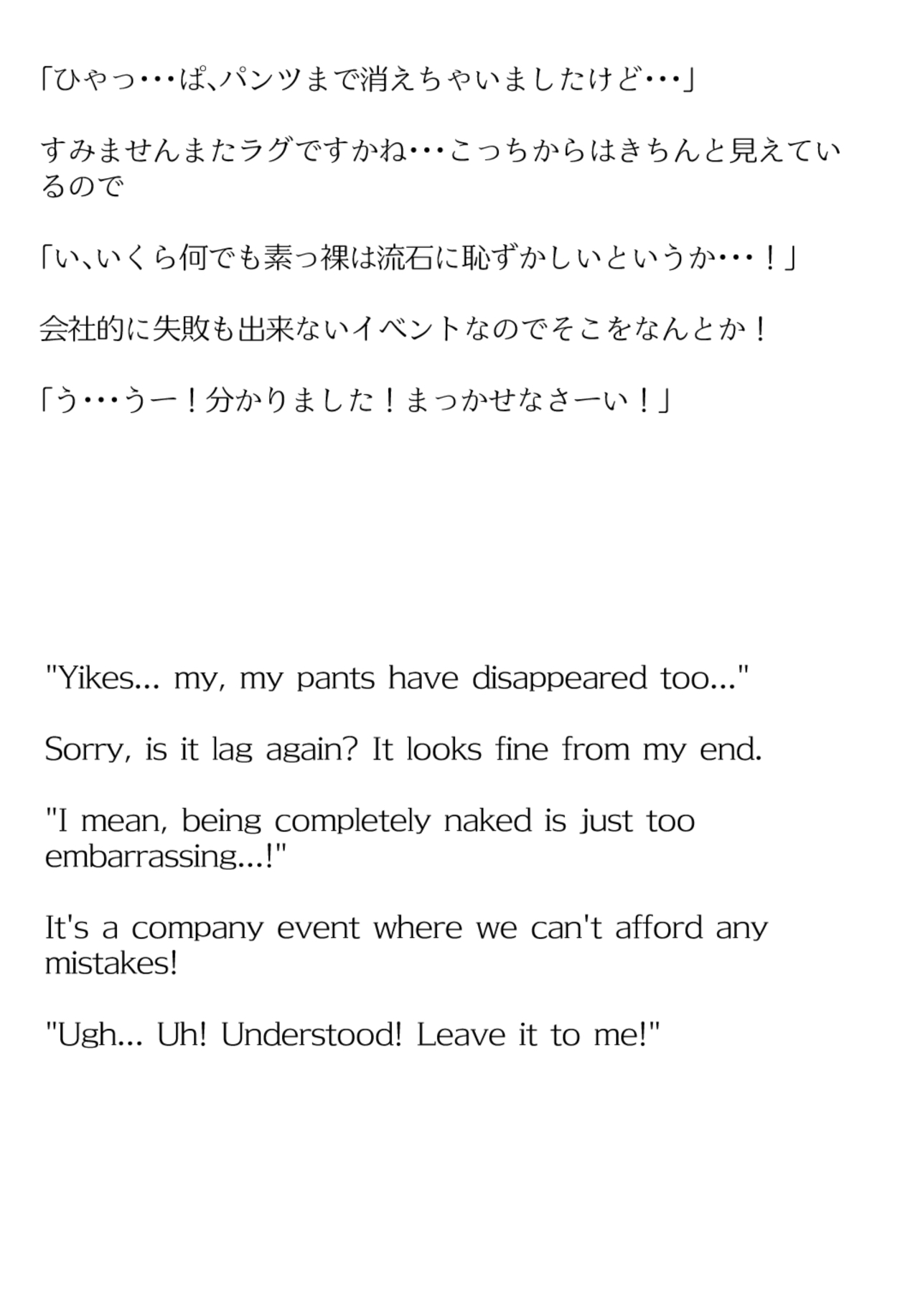 バーチャル衣装が故障して皆の前で全裸になってしまったしかしそれは自分から見た時だけのようで・・・会社の命運をかけたイベントはそのまま続行されることに!A virtual costume malfunctions and she is completely naked in front of everyone!But that was only from her point of view...the event with the fate of the company at stake was to continue as is!