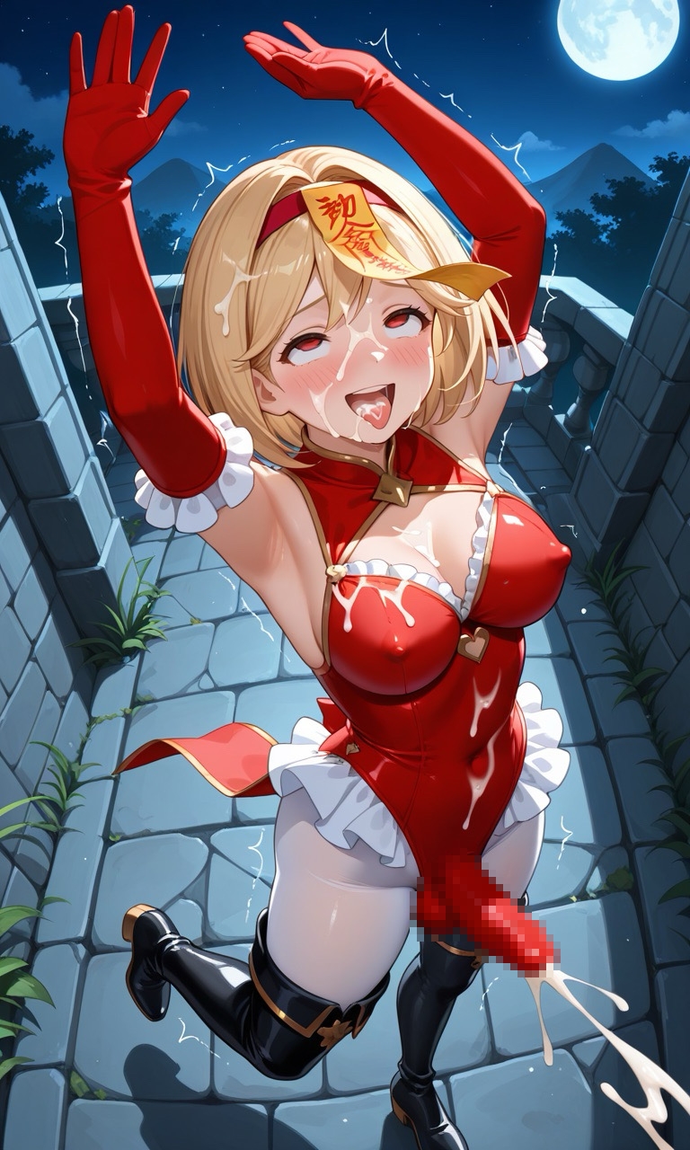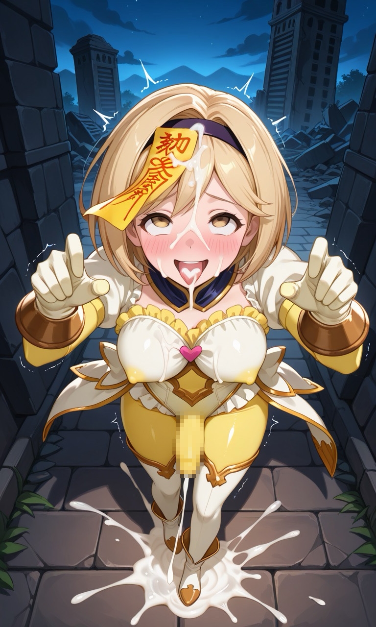 マヌケ感を増すために女の子は額に怪しい御札が貼られてまるで催○・洗脳状態のふたなりとなって、本来は見せることのない下品なポーズと表情をうかべています。