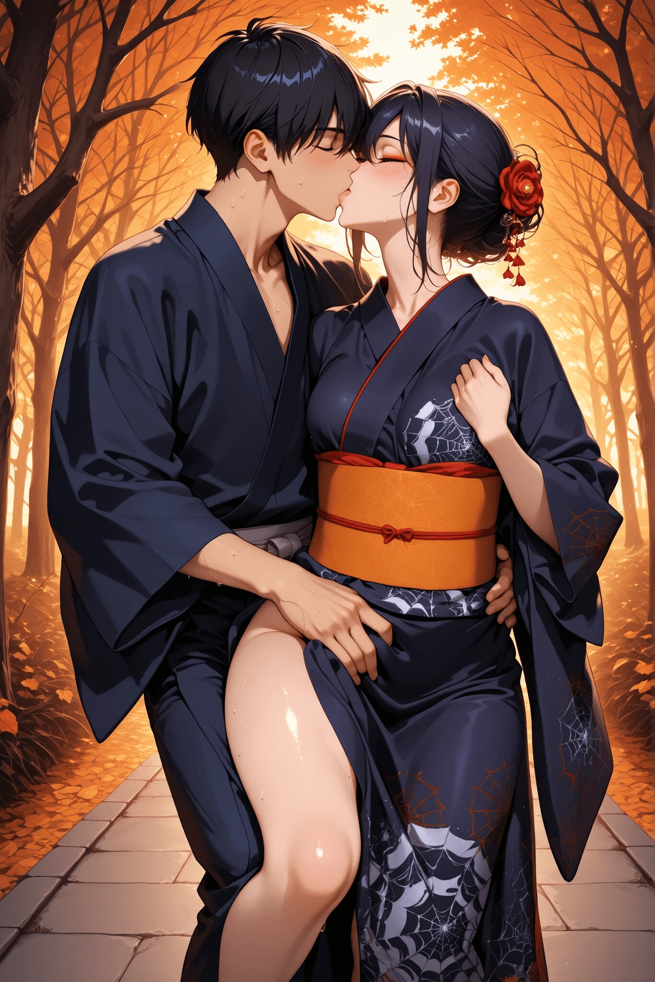 みんないろいろな格好でトリックオアトリートなえっちを楽しんでいるが、この作品では和服で着たままえっちしている人たちをクローズアップしている。