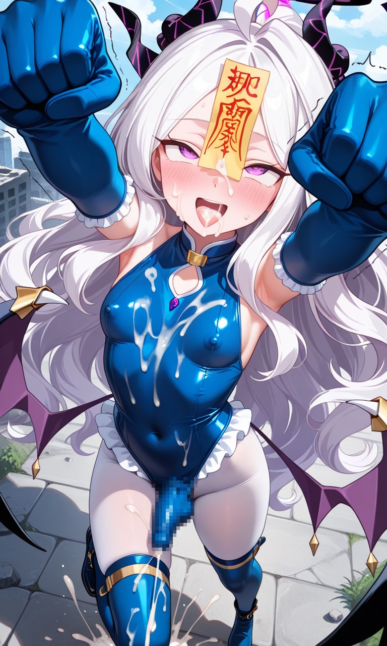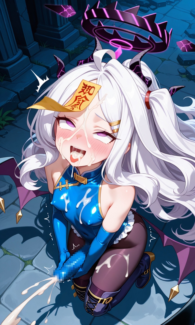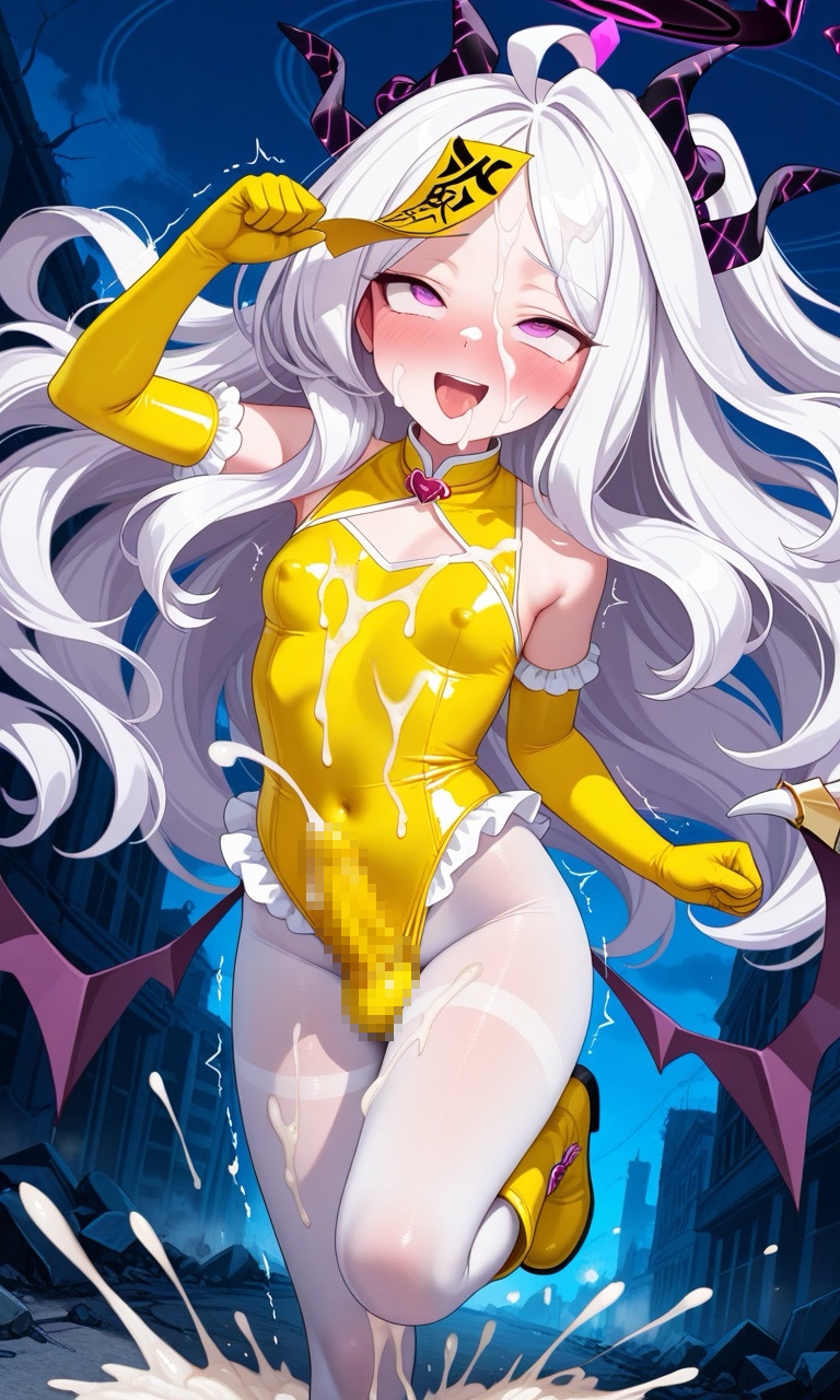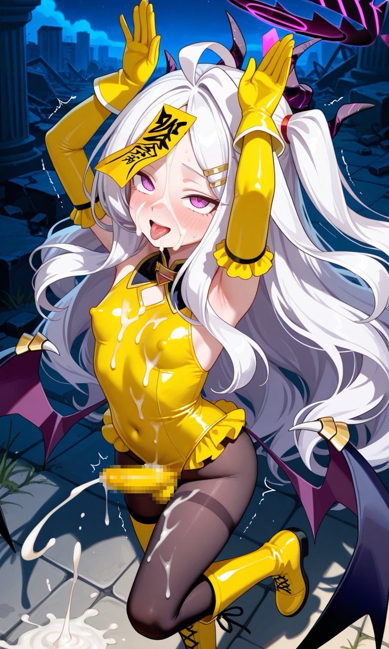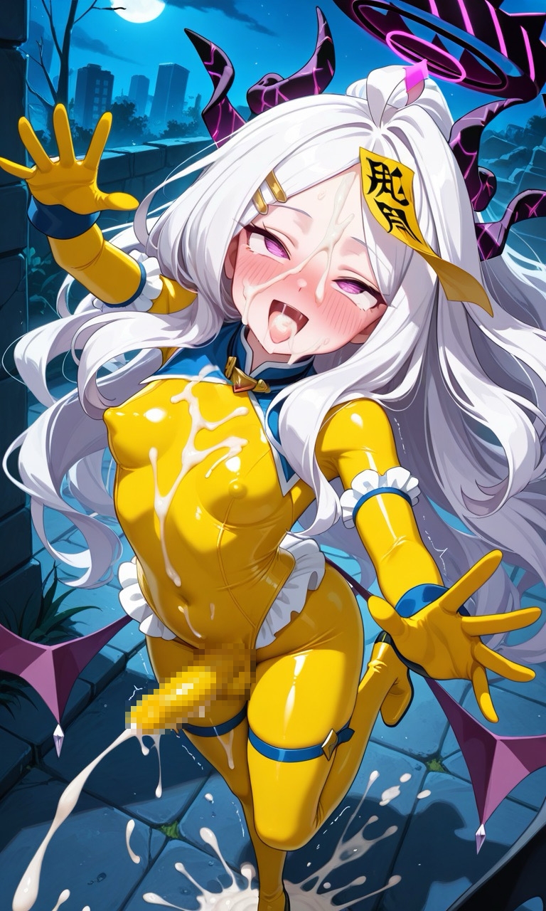 間抜け感を増すために女の子は額に怪しい御札が貼られてまるで催○・洗脳状態のふたなりとなって、本来は見せることのない下品なポーズと表情をうかべています。