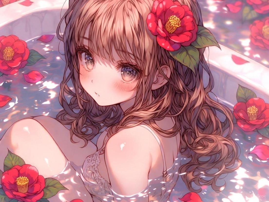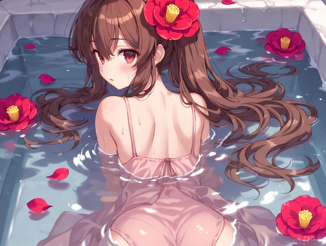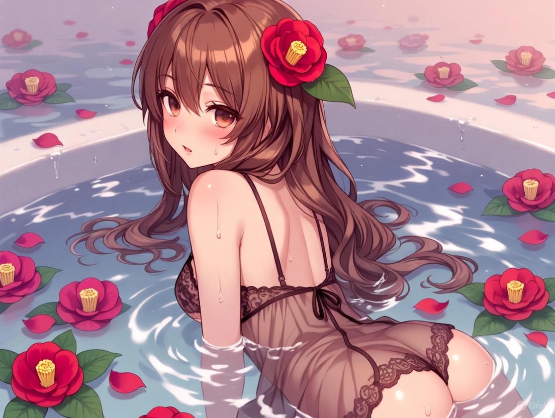 椿娘 001【匂い立つ湿度】濡れ透け白ランジェリーと椿の美少女 - 肌に張り付く極薄布の質感 - 【尻/バックショット/AI高解像度/差分あり】