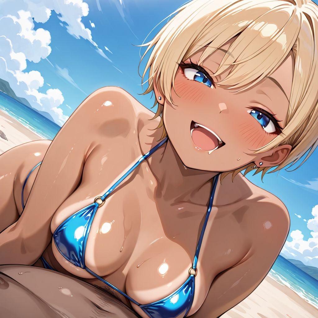 青空と波音に包まれながら、彼女の完璧なボディにオイルが滴り落ち、光沢マイクロビキニが食い込み、豊満すぎる胸がヌルヌルとテカテカに濡れそぼる…。