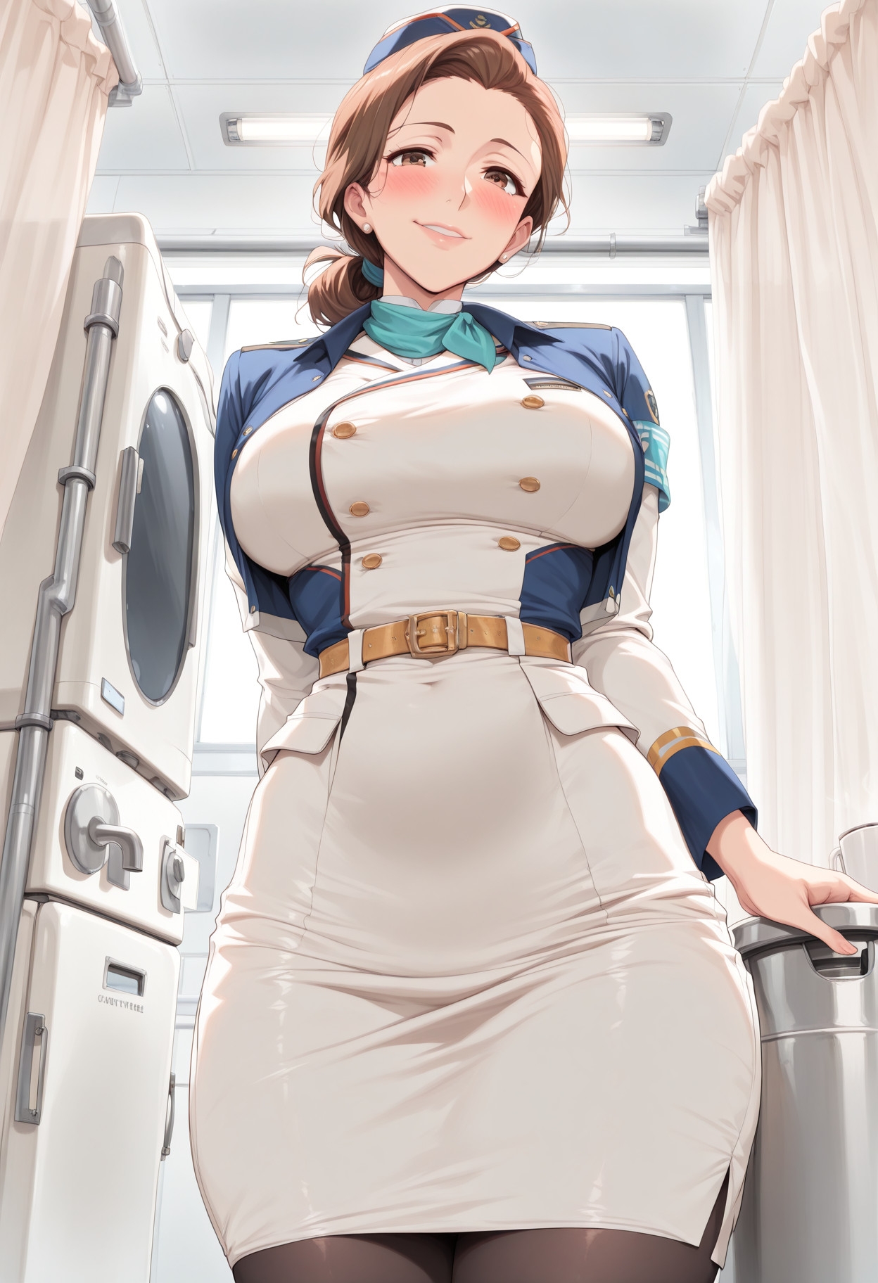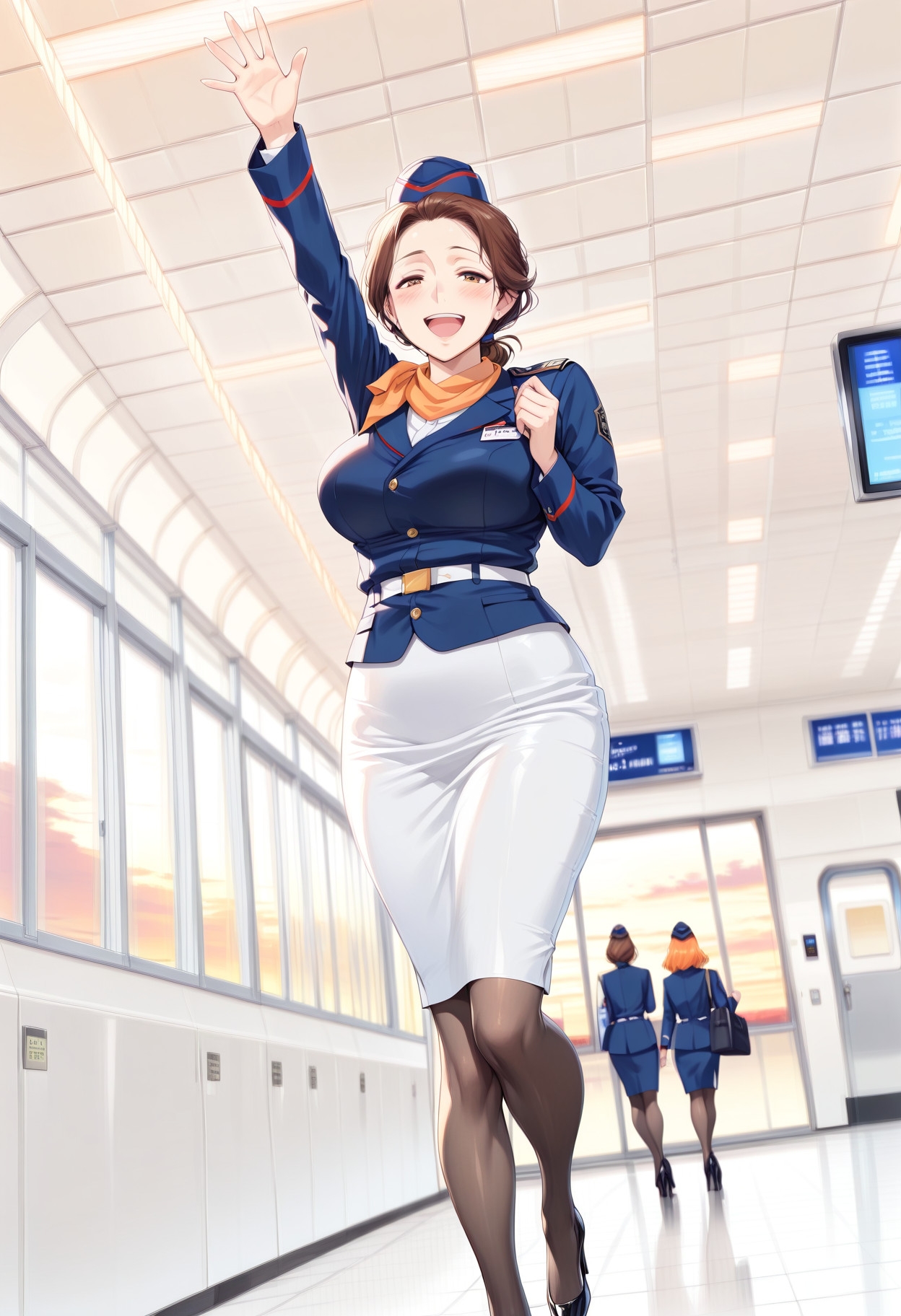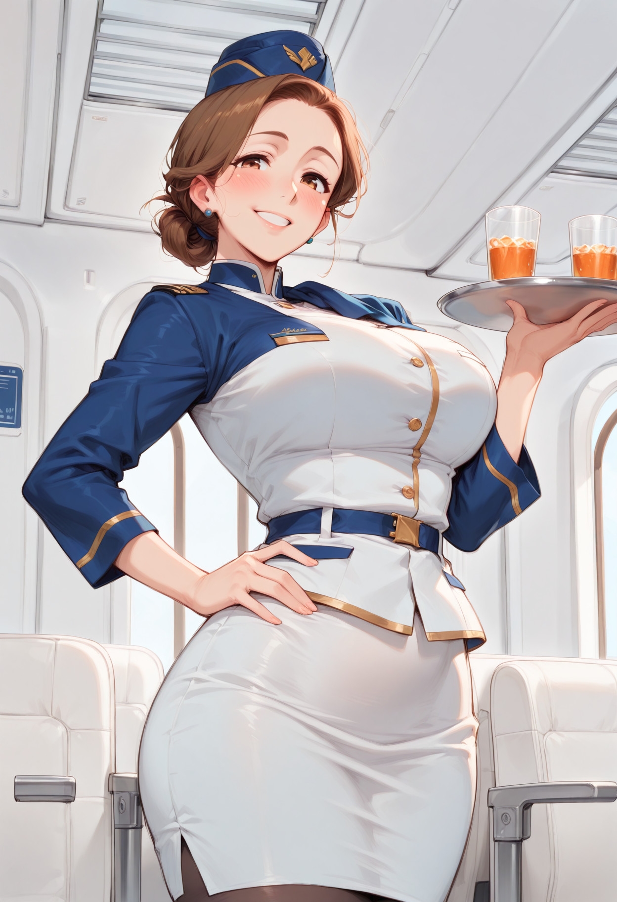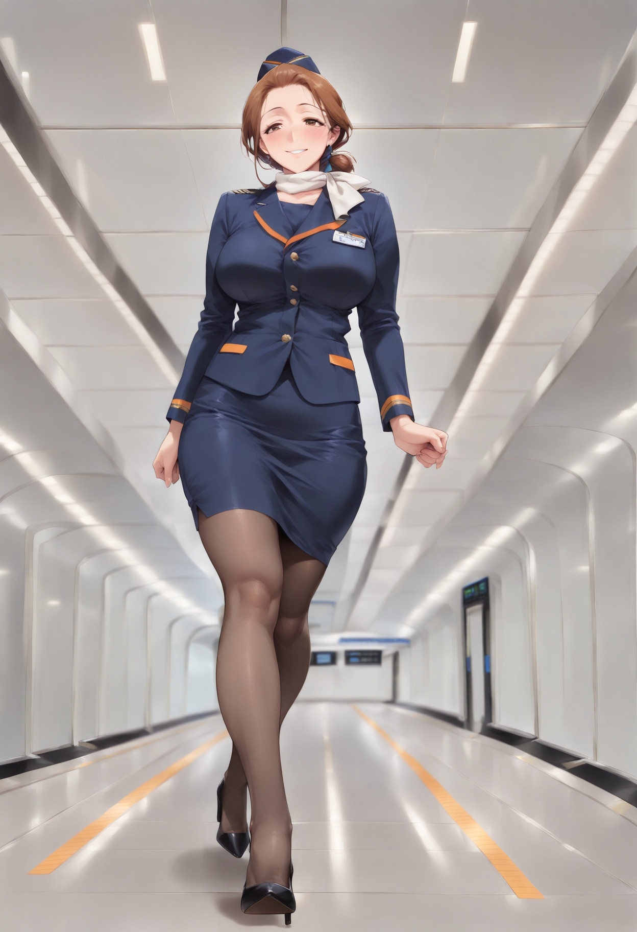 【キャラクター】明日香(Asuka)あなたの職場の上司であり、秘められた恋人。年齢を感じさせない美貌と、包容力のある大人の肉体を持つ。今回はチーフパーサーの制服に身を包み、あなたに尽くします。
