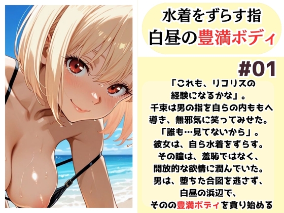 「これも、リコリスの経験になるかな」。 千束は男の指を自らの内ももへ導き、無邪気に笑ってみせた。 「誰も…見てないから」。 彼女は、自ら水着をずらす。 その瞳は、羞恥ではなく、 開放的な欲情に潤んでいた。 男は、堕ちた合図を逃さず、 白昼の浜辺で、 そのの豊満ボディを貪り始める"