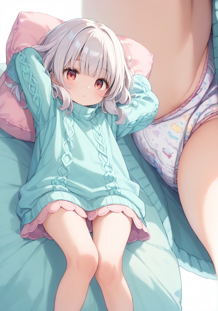 ふとももにかかるニットの裾、恥じらいながらも隠しきれないパンチラの誘惑。