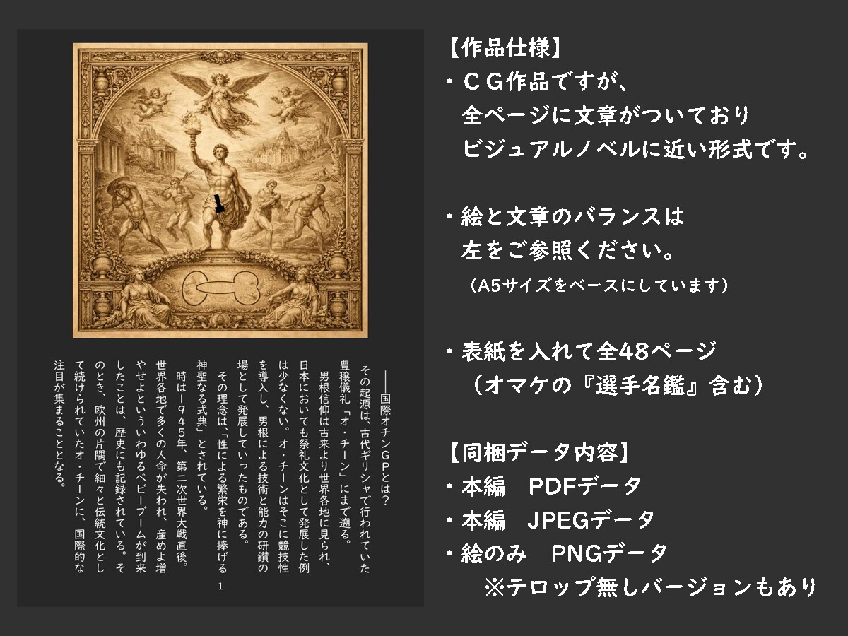 「おはようございます、実況のジョニー・片山です。こちらは南城マサヒロさんです」「いやぁ、いろいろ課題はありましたがようやく始まりましたね!この日をずっと楽しみにしていましたよ」「マサヒロさん、これ本当にエロ同人なんですか?なんか絵面が男だらけじゃないですか?」「ええ、こちらは18禁のエロ同人そのものです。見どころは、人類繁栄の根本的な活力である【オチン】で競い合うところですね。本来であれば20種類くらいの競技があったのですが、放送時間の問題で収録はたったの4種類になってしまいました」「実用性はあるのですか?ちゃんと女性はいるんですよね?」「ええ、各選手にはパートナーと呼ばれる素晴らしい女性(一部男性)がサポート役としてついています。私たちの実況・解説のせいで『股間に集中できない!』という声もありますが、ちゃんとCG単独も用意してあるのでご安心ください!テトラ・アスロンは『パートナーの仕上がり状態』を採点する競技なので実用性抜群です!」「なるほど、それなら安心ですね!では皆様、体験版か、または製品版でお会いしましょう!」 アメリカ代表:シコリティ選手古き良きアメリカンスタイルで、今回の優勝候補です!チアリーダーによるサポートという安定感を見せます!