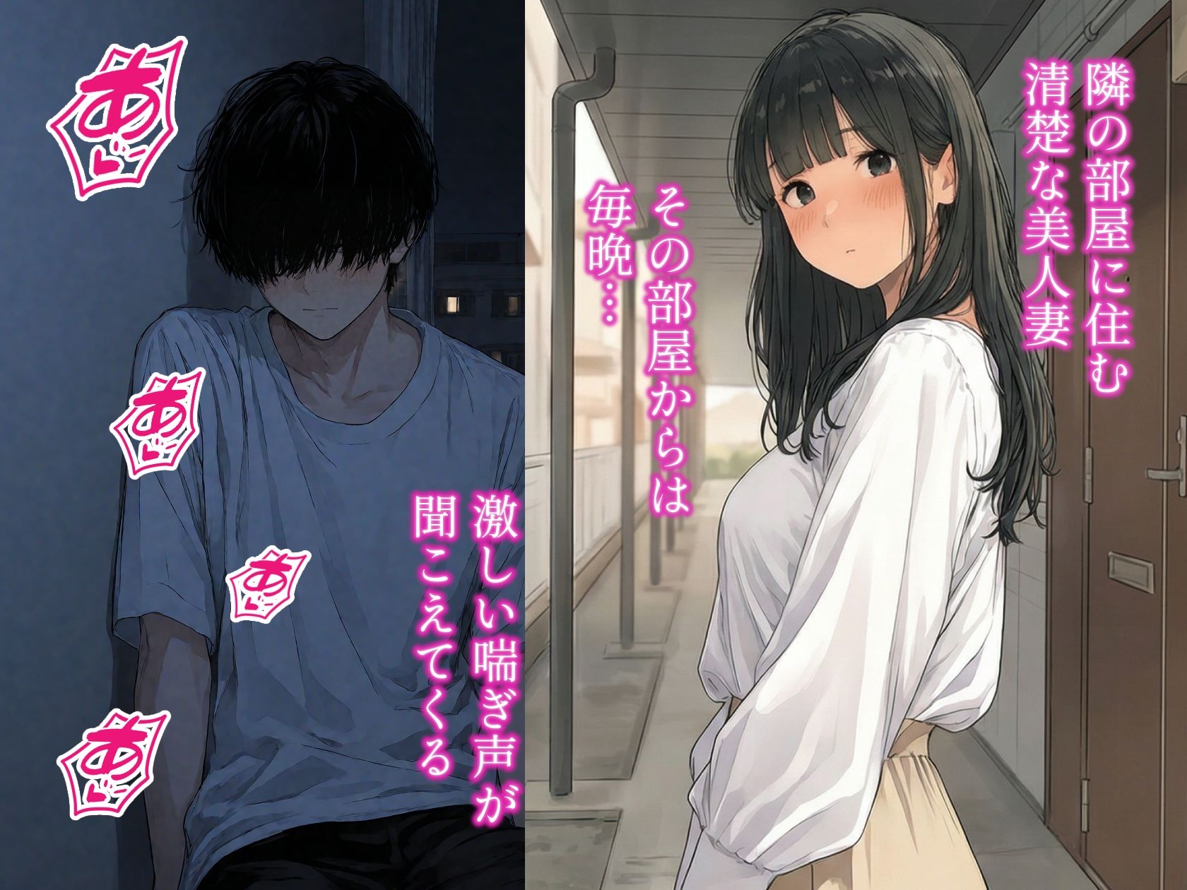 ボロアパートに住むフリーターの浦野健太は、毎晩壁の向こうから聞こえてくる、艶めかしい「喘ぎ声」に悶々とする日々を送っていた。声の主は、隣に住む佐伯美緒。白いブラウスが似合う、誰もが振り返るような清楚で上品な美人妻だ。