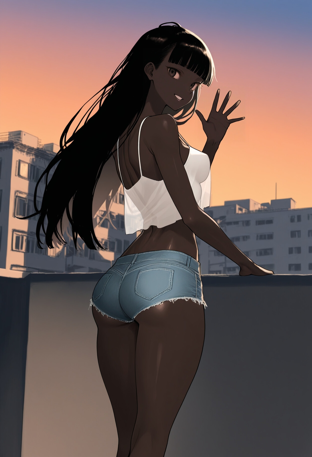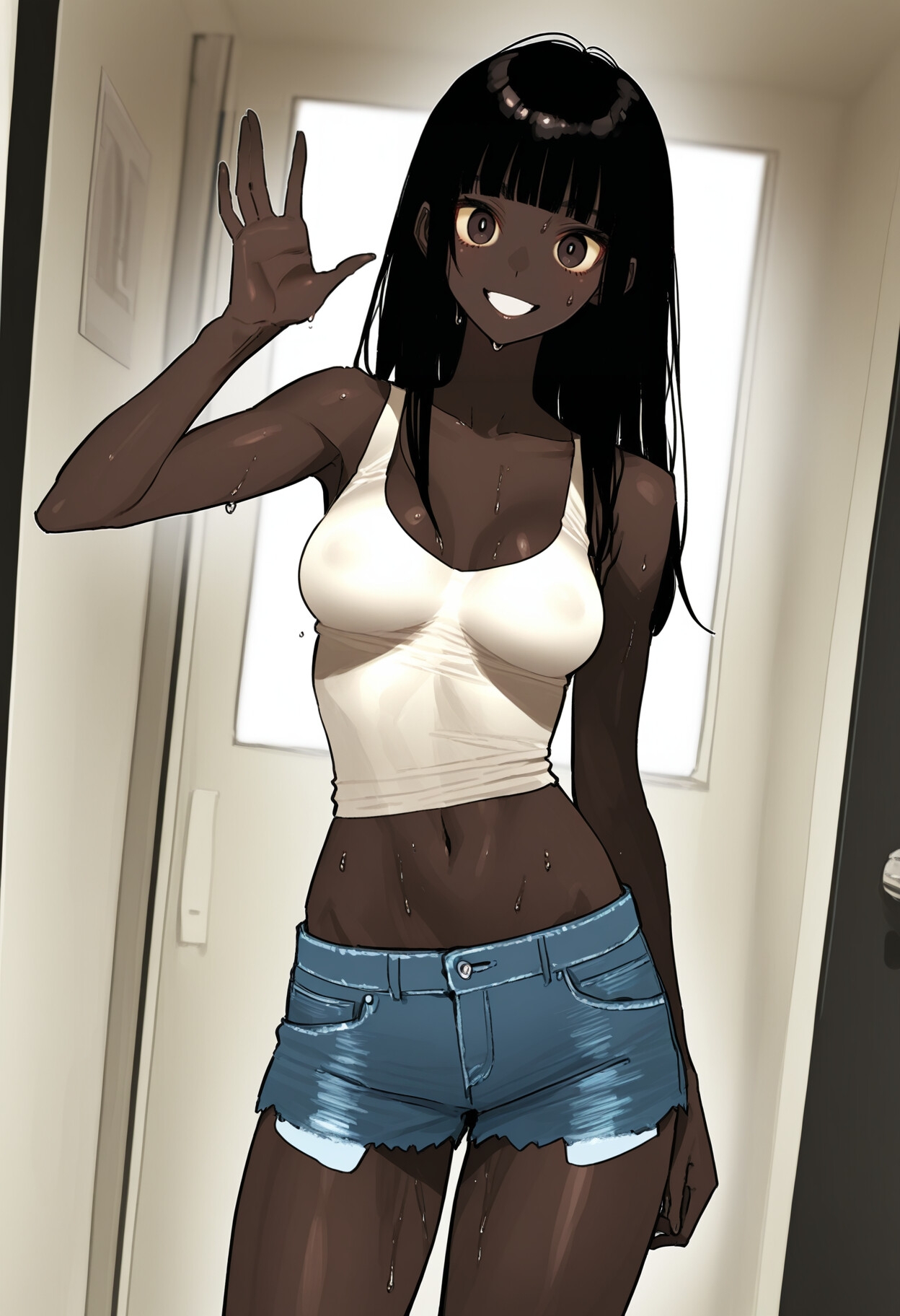 アリアは熱波を纏ってやって来た。白いキャミソールは第二の皮膚となり、汗は黒曜石の肌を滑り、銀の軌跡を描く。デニムは短く、太腿の裏側にまで陽光の舌が這い、蜜のような汗を残していた。