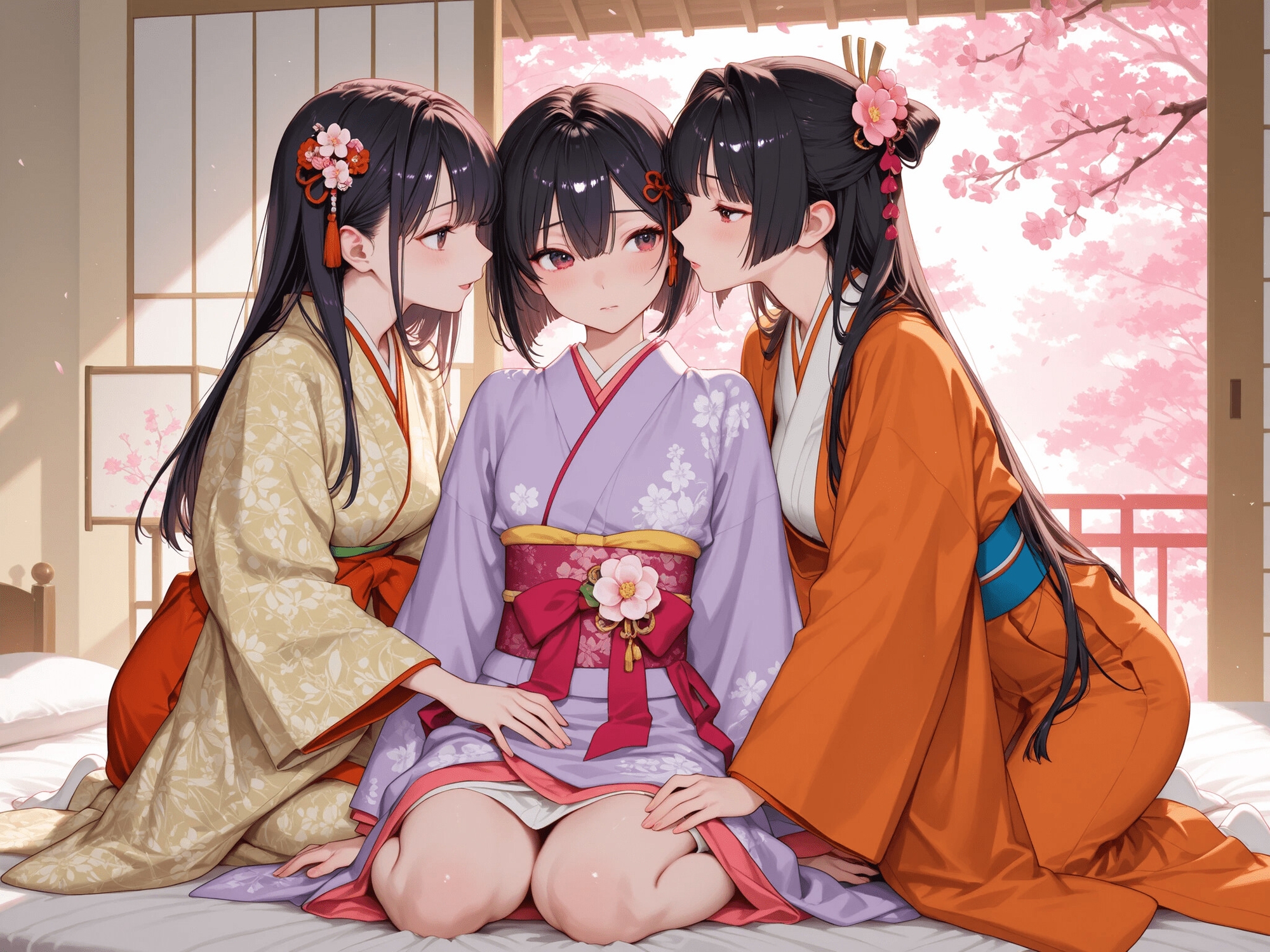 我慢できなくなった三人官女たちで百合えっちを始めた。なぜか出現していた張り型も使って淫らな行為に興じ始めた。小さくてもいいから本物の肉棒が欲しいと言って近くを歩いていた五人囃子を連れ込み、彼の「笛」をむき出しにして弄んだ。