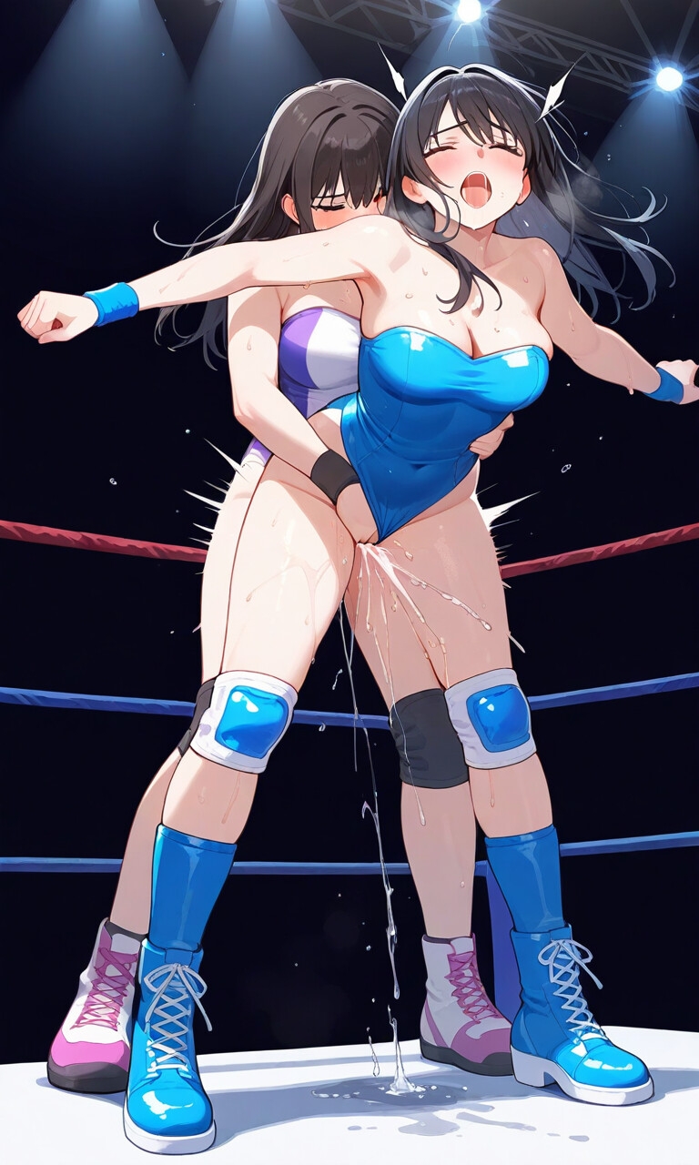 レッスルエンジェルスのキャラクターたちとうちの看板レスラー桜庭愛との試合風景。