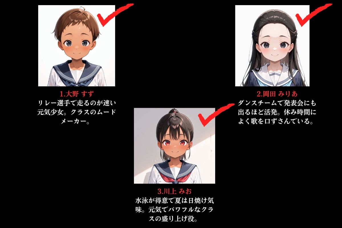 特徴: リレー選手で走るのが速い元気少女。クラスのムードメーカー。