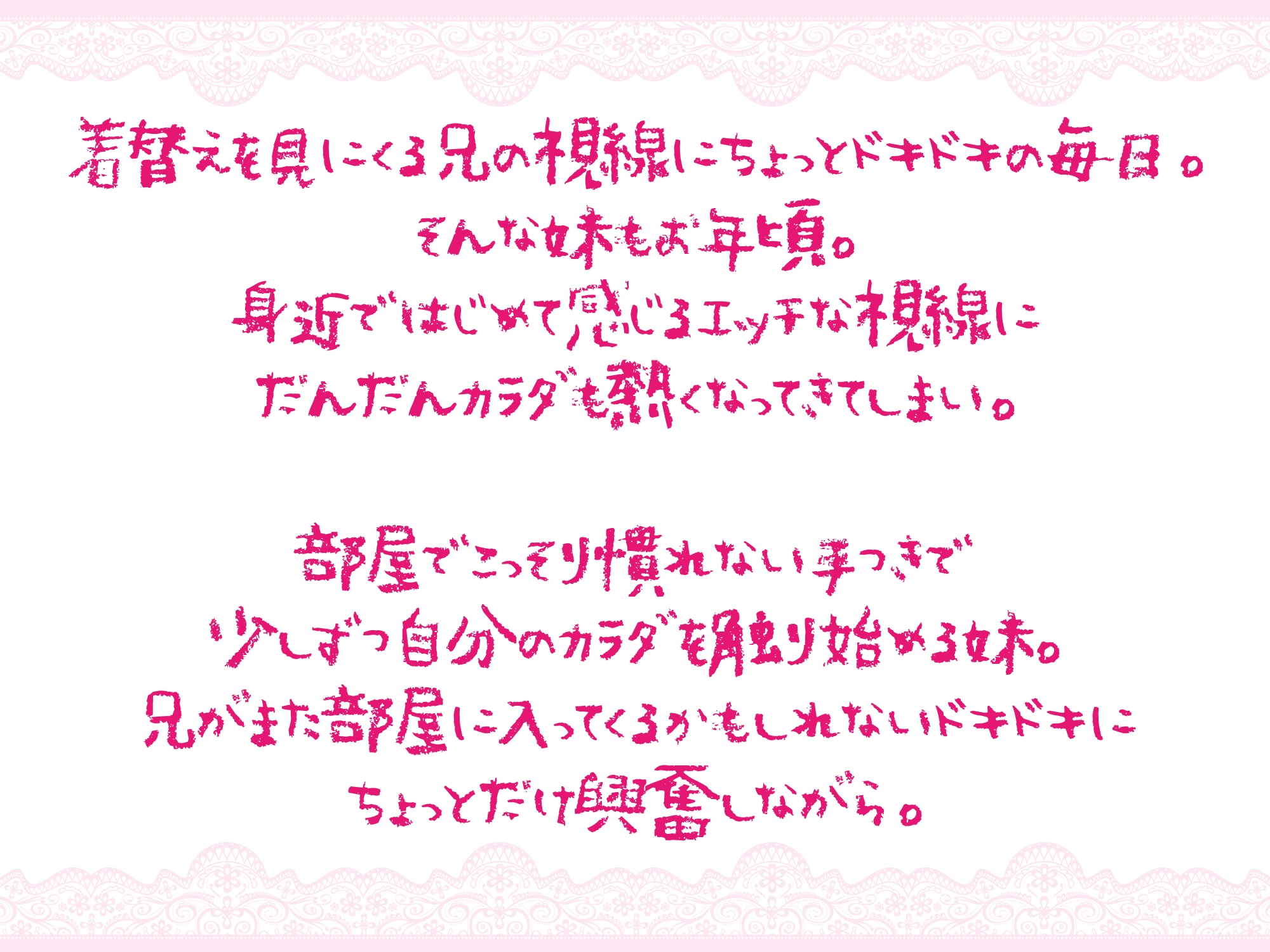 それどころか、お兄ちゃんの行動に、少しずつ自分の体がドキドキし始めることに気づき始める。