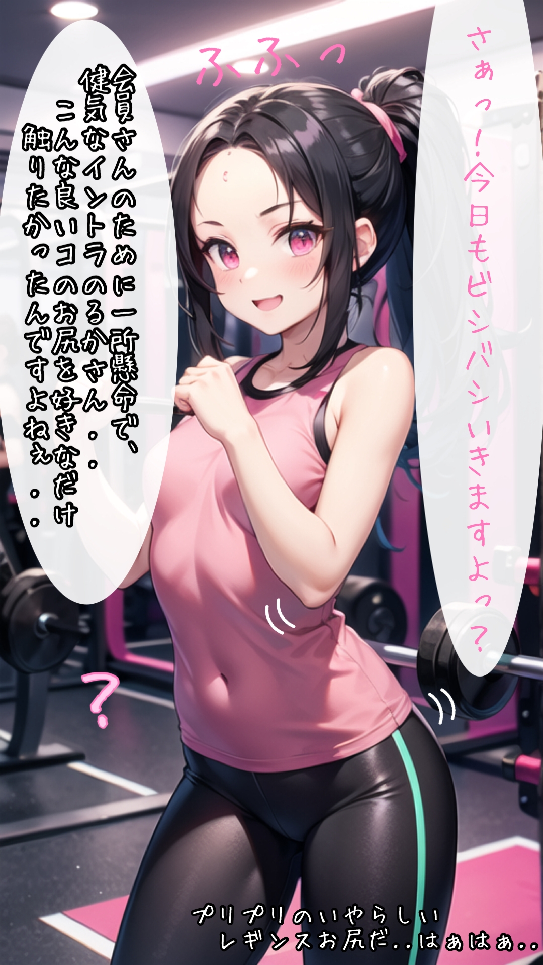 ジムインストラクターRukaボクの通うジムのイントラさん。いつも元気に迎えてくれ、汗だくで頑張っている。しかし、レギンスにくっきり浮かび上がるピチピチお尻と、小さな胸の谷間がチラ見えするタンクトップ姿目当てに通う中年男性が、客層の大半を占める。