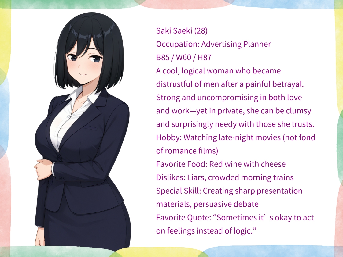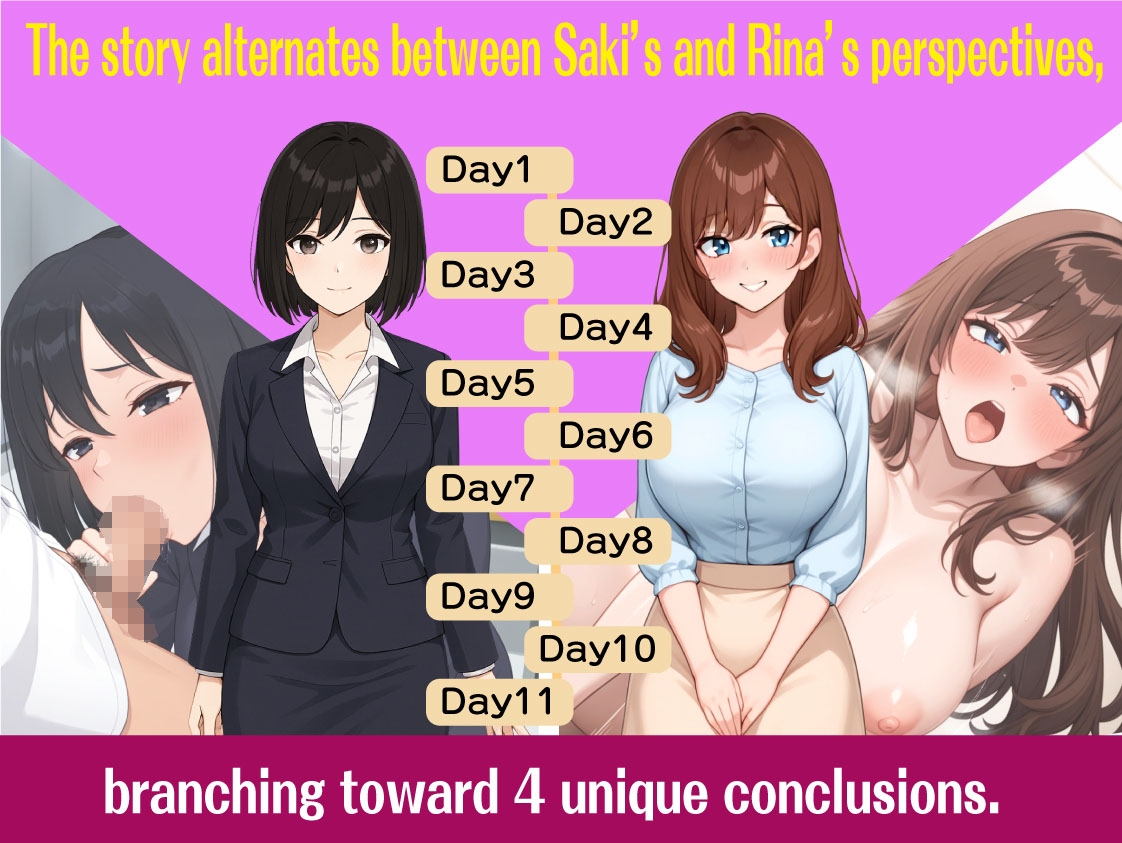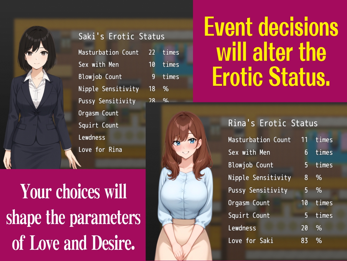 ◆ Story"We believed we could be happy together, just the two of us as women…"Saki Saeki (28) and Rina Takashina (25) are lovers who carry deep scars from past experiences with men.They’ve lived supporting each other as their only refuge.But one day, cracks begin to form in their relationship.At work, men draw closer—temptations impossible to resist.The pure love they swore to live by, “only as women,” slowly begins to falter, shaken by betrayal and intoxicating pleasure.This is an NTR-style adventure game depicting how a devoted yuri couple is tempted, corrupted, and broken by men.Depending on the player’s choices, you can fight to preserve their love—or let them sink into a spiral of lust and ruin.The story alternates between both heroines’ perspectives, featuring 12 in-game days and 4 unique endings.