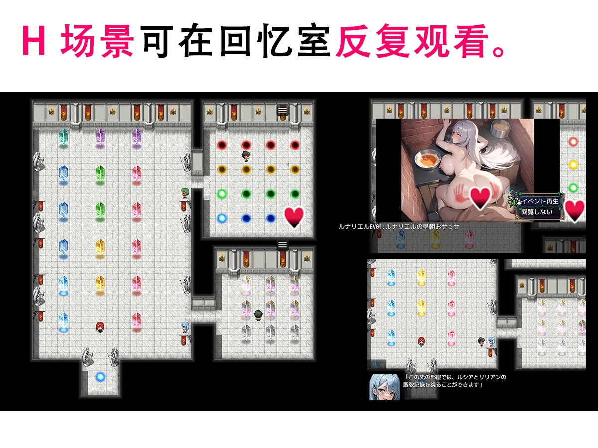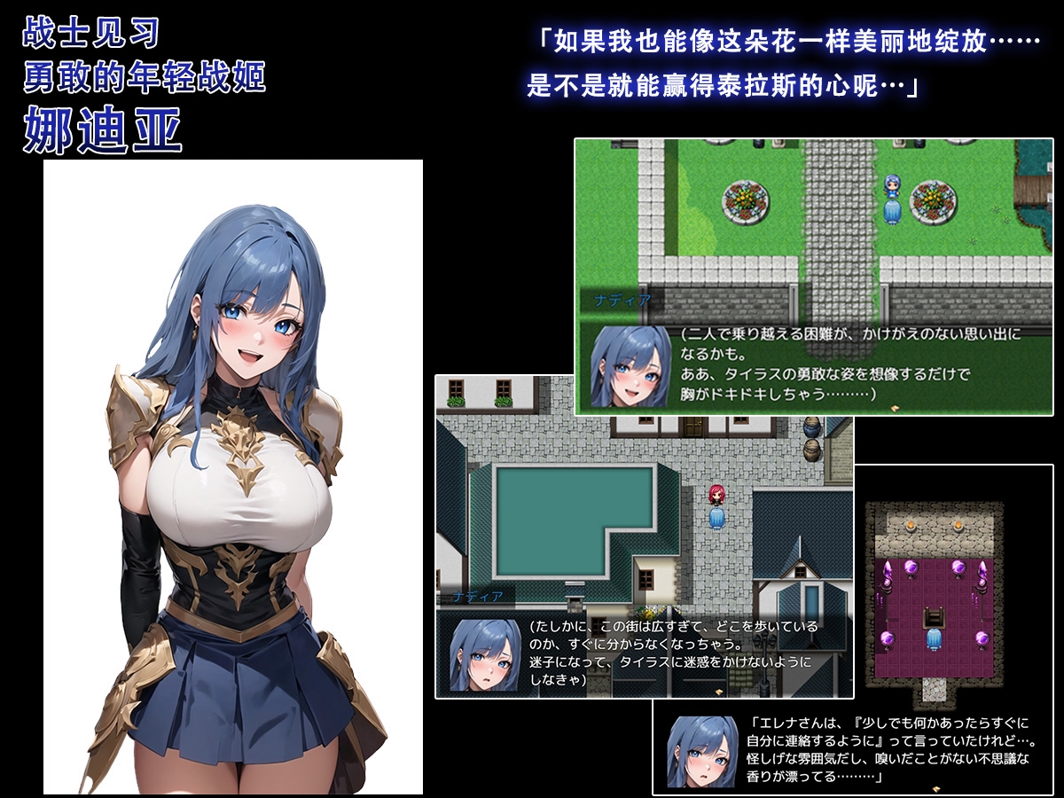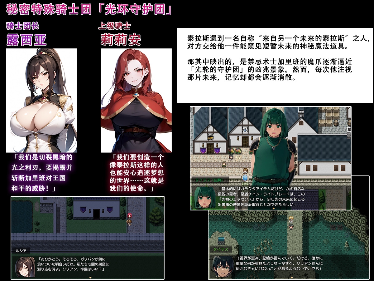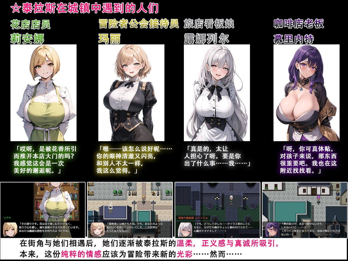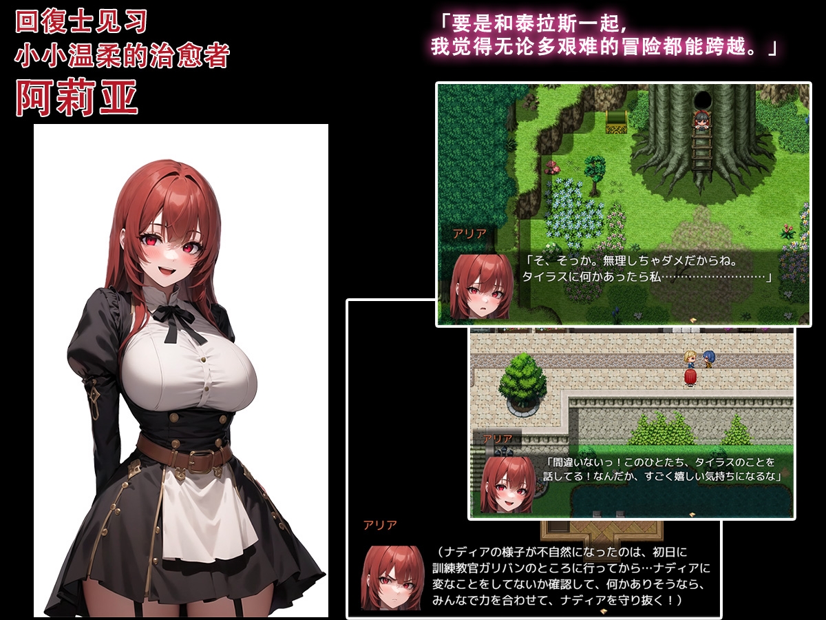 本作的文本为简体中文配音为日语。CG 总数:约 490 张基本 CG 数:约 60 张怀揣梦想的泰拉斯与伙伴们来到大都市埃斯梅拉尔迪娅立志成为冒险者。途中他们遇到自称“来自另一个未来的泰拉斯”的人物。泰拉斯从对方手中得到了一件神秘道具能够短暂窥见未来但那段记忆很快就会消散。而另一方面在教官加利凡的禁咒下女主们被灌输虚假常识和扭曲性癖渐渐陷入被寝取的深渊。伴随跨越时空的邂逅一段命运物语即将拉开帷幕。※本游戏使用「RPG Maker MZ」制作。请先通过体验版确认能否运行后再购买。(体验版的存档无法继承到正式版)※本作品的 CG 基于使用 Stable Diffusion 生成的图像再加以人工修饰与拟声词等处理。