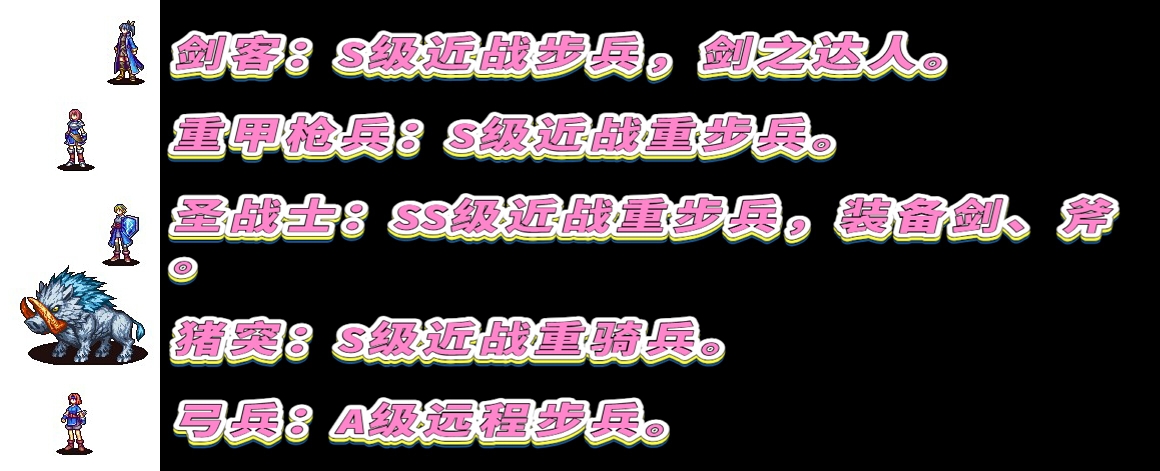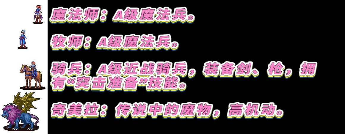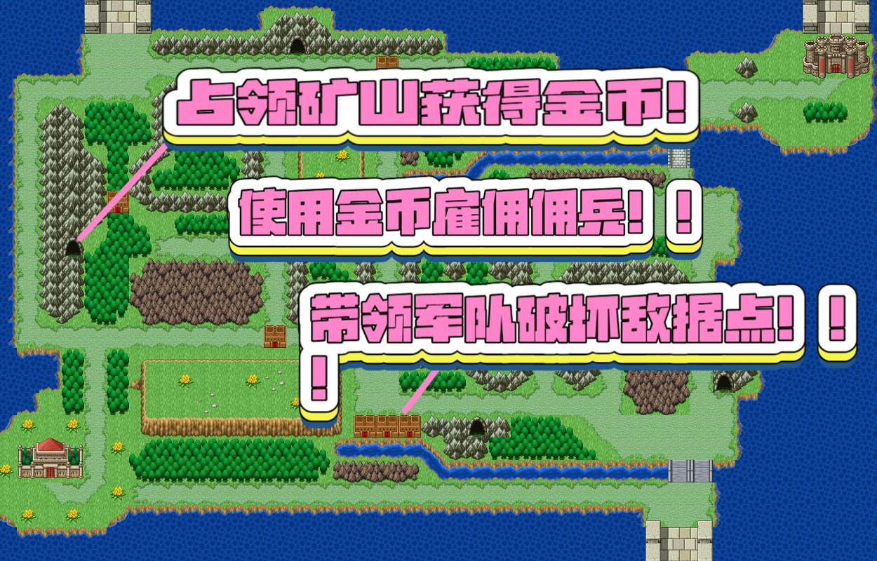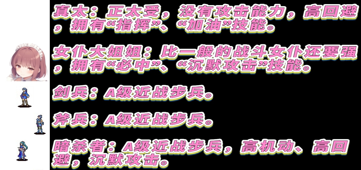 此游戏的剧情文本、游戏说明文字由人工翻译为中文。少部分界面文字由于各种原因没有进行翻译,为日文原文。 占领矿山获得金币!使用金币雇佣佣兵!!带领军队破坏敌据点!!! 真太:正太受,没有攻击能力,高回避,拥有“指挥”、“加油”技能。女仆大姐姐:比一般的战斗女仆还要强,拥有“必中”、“沉默攻击”技能。剑兵:A级近战步兵。斧兵:A级近战步兵。暗杀者:A级近战步兵,高机动、高回避,沉默攻击。剑客:S级近战步兵,剑之达人。重甲枪兵:S级近战重步兵。圣战士:SS级近战重步兵,装备剑、斧。猪突:S级近战重骑兵。弓兵:A级远程步兵。魔法师:A级魔法兵。牧师:A级魔法兵。骑兵:A级近战骑兵,装备剑、枪,拥有“突击准备”技能。奇美拉:传说中的魔物,高机动。 虽然本作剧情是系列前作的后续,可是前后关联不大,直接从本作玩也没有太大问题。