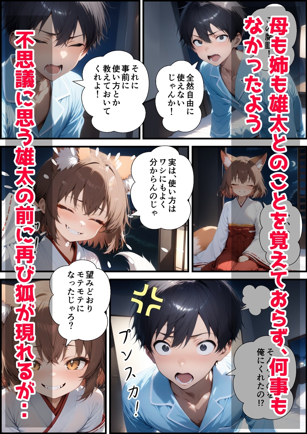 ・オリジナルのエッチなラブコメ。・主人公が手に入れた魔眼で姉と母に催〇をかけてエッチするというお話です。・主人公の山本雄太は、写真撮影に出かけた山奥の神社で蔦に絡まって身動きできない狐を助ける。その夜、恩返しにやってきた狐から、昼間のお礼に「相手を惚れされることができる魔眼」を授かった。・さっそく姉に使ってみる雄太。ちょっと姉に言うことを聞かせようと思っただけだったが、姉は完全に発情して雄太に迫ってきた。まんざらでもない雄太も流されるままに姉とエッチしてしまった。・魔眼の扱には気をつけなくちゃと思っていた矢先、母も催〇をかけてしまう。・息子の筆おろしは私がする!と雄太に迫る。色気むんむんの母とも当然エッチしてしまった。・明るい雰囲気のラブコメになってます。・AIでCGを作成し、クリップスタジオでセリフ、効果音等を入れてマンガに仕立てています。・カラー・マンガ107ページ(登場人物、あとがきを含む)・登場人物はすべて20歳以上です。・すべてのCGはStable Diffusionで生成し、クリップスタジオでコマ割り及びセリフ付けをしています。・AI生成ですので手足指などおかしなところがあり、また衣服が統一されてないなど不備な点は多々ありますが、予めご了承ください。・このお話はフィクションです。実在の人物・作品・団体・出来事などとは関係ありません。