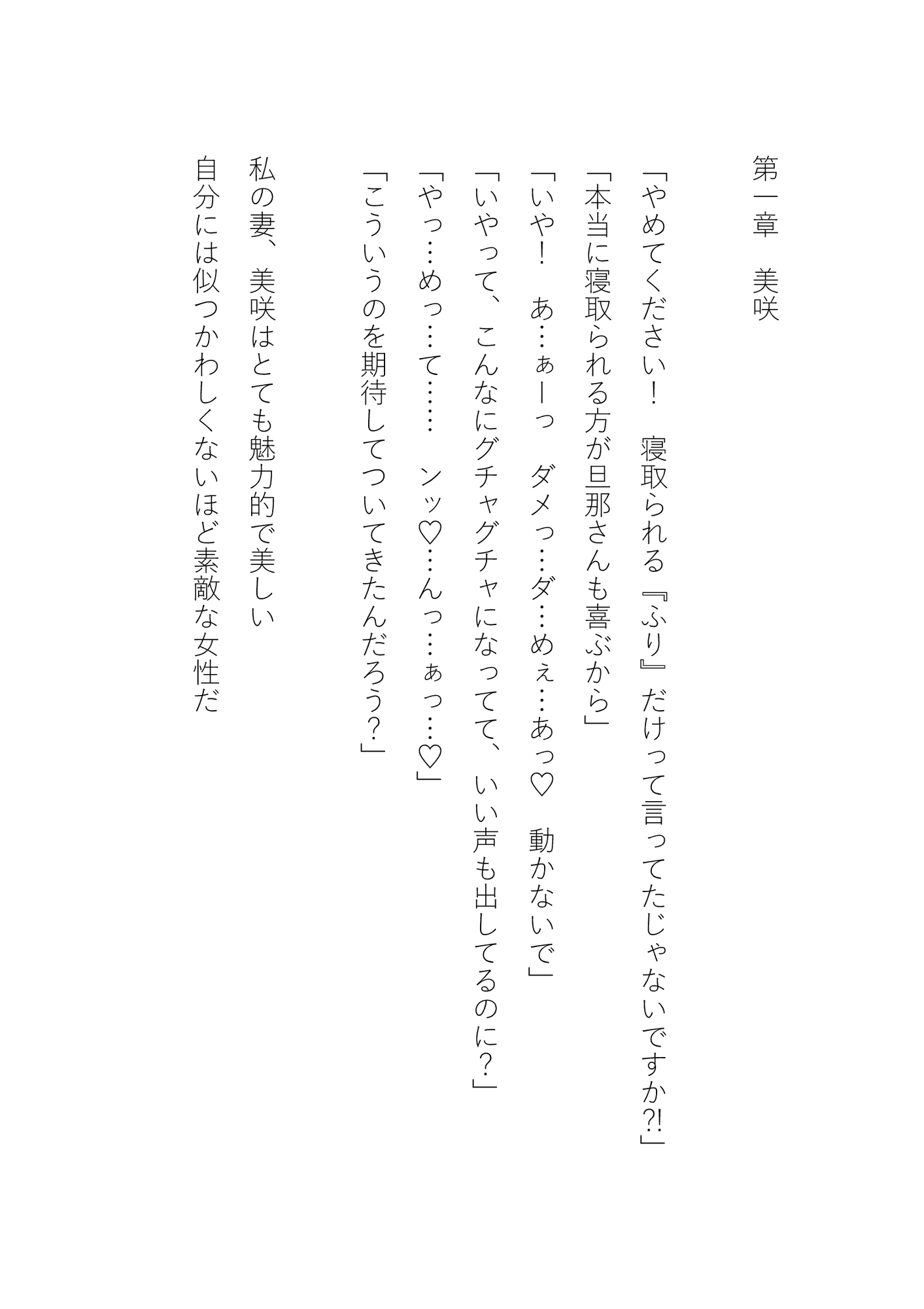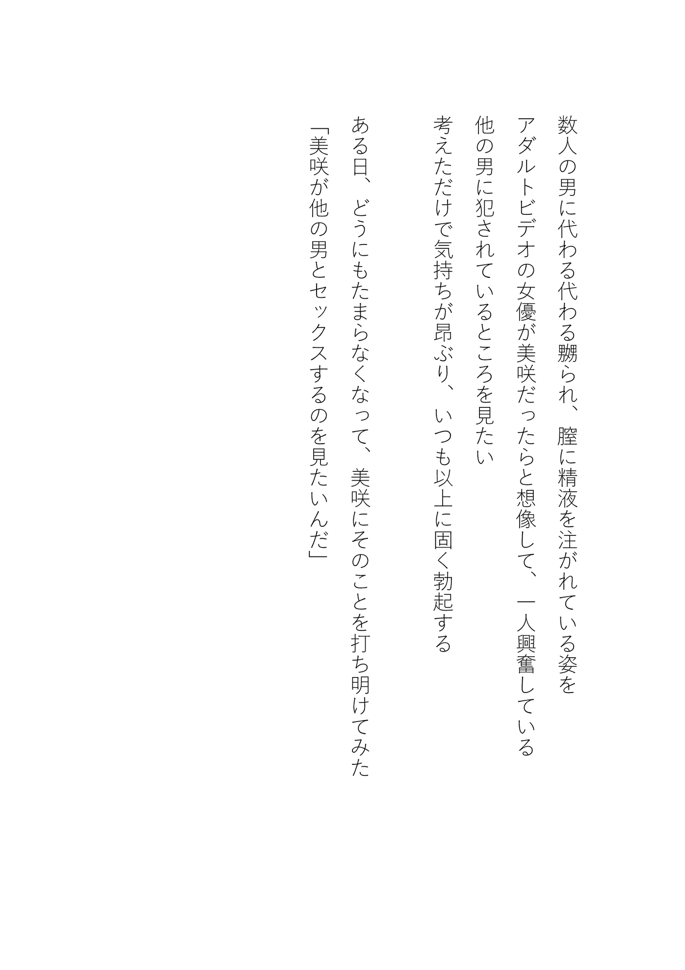 「美咲が他の男とセックスするのを見たいんだ」 宏樹は美しい妻・美咲と幸せな結婚生活を送っていたが、いつしか妻が他の男性に抱かれている姿を見たいという妄想に囚われる。その欲望を美咲に打ち明けた夫と、そんな歪んだ願いにも健気に答えようとする妻……