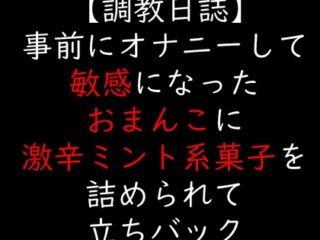 事前にオナニーして敏感になったおまんこに激辛ミント系菓子を詰められて立ちバック