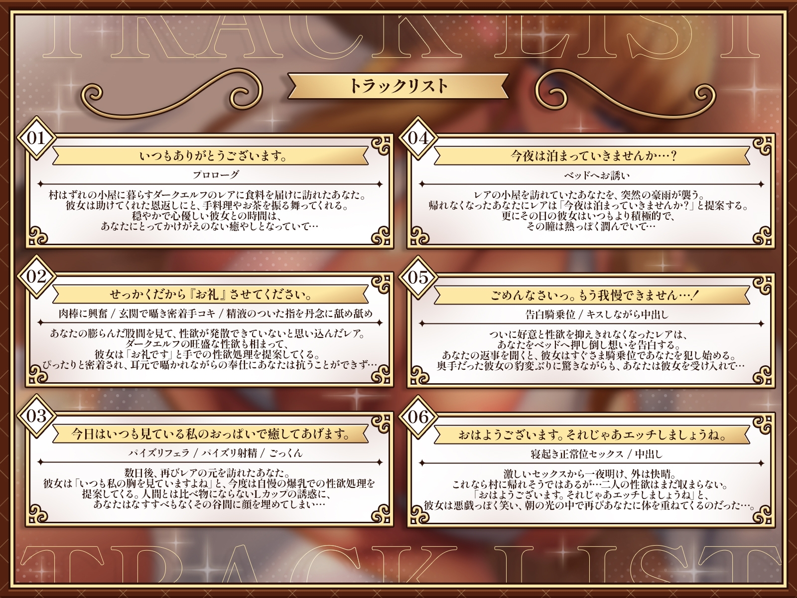 物腰柔らかで超奥手なダークエルフ。行き倒れていたところをあなたに助けられて以来、強い好意を抱いている。ダークエルフ特有の旺盛な性欲を必死に抑えているが、一度タガが外れると、あなたを激しく求め、そのむちむちボディでとことん尽くしてくれる。 Track01:いつもありがとうございます。(プロローグ)村はずれの小屋に暮らすダークエルフのレアに食料を届けに訪れたあなた。彼女は助けてくれた恩返しにと、手料理やお茶を振る舞ってくれる。穏やかで心優しい彼女との時間は、あなたにとってかけがえのない癒やしとなっていて…