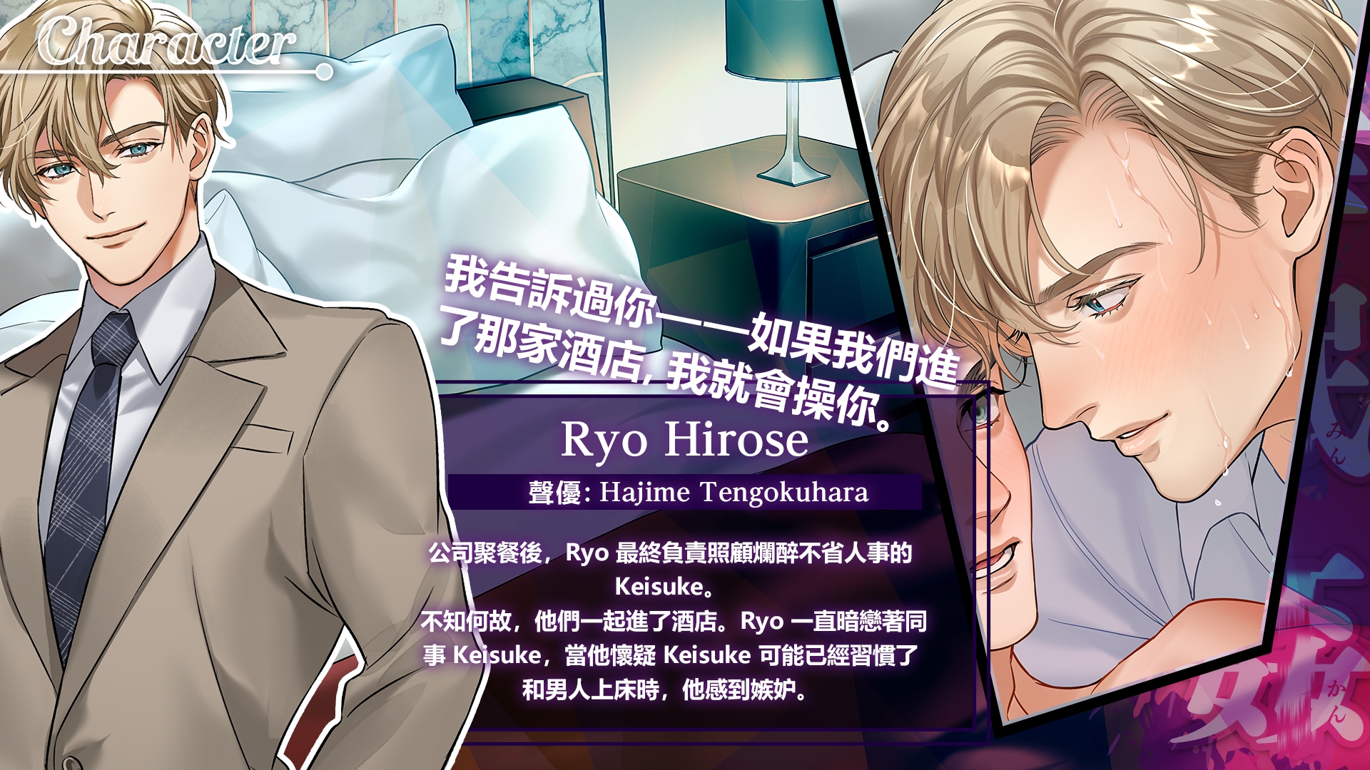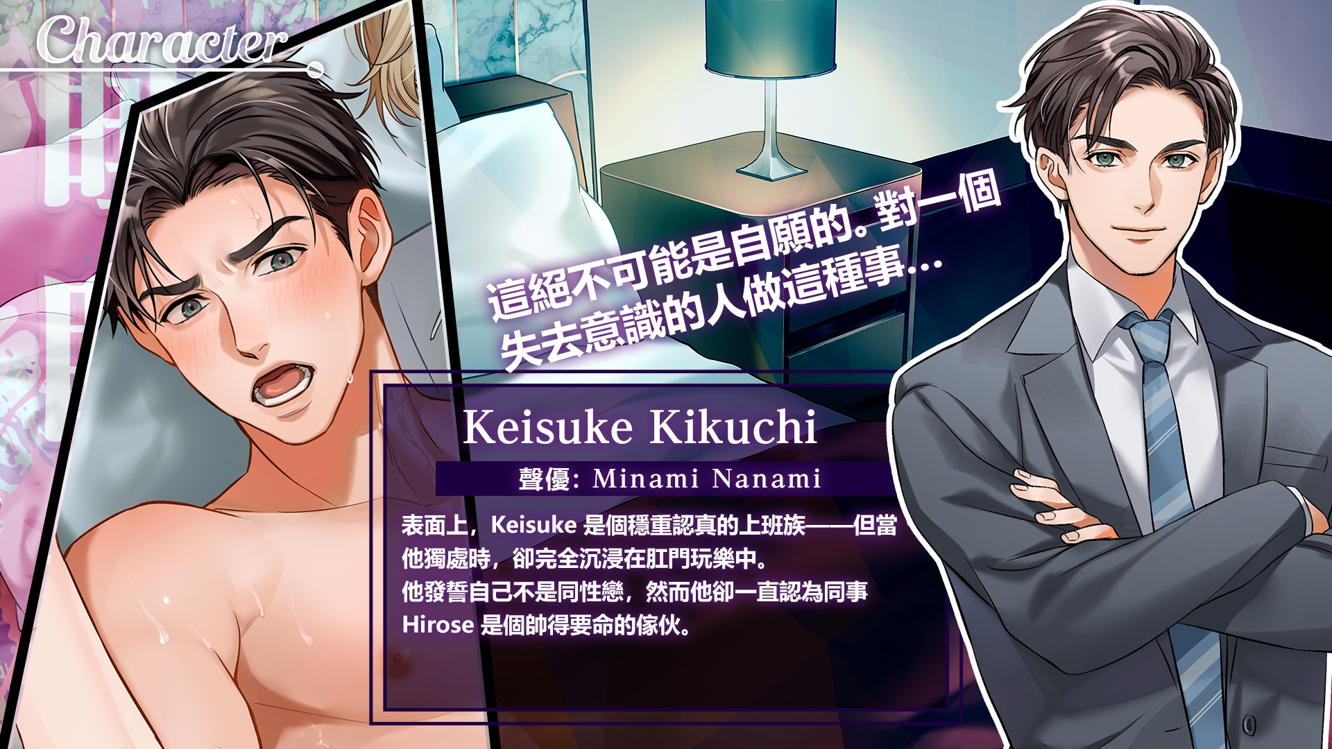 ■□━━━━━━━━━━━━━━━━━━□■賦予角色生命的嗓音■□━━━━━━━━━━━━━━━━━━□■這一次,由 Minami Nanami 以細膩而火熱的演技,演繹了通常表現強硬,但最終在醉酒迷糊中交出身軀的 Keisuke Kikuchi。魅力十足卻內心佔有慾極強的“王子型”上位者 Ryo Hirose,由 Hajime Tengokuhara 的激情演出賦予了生命!