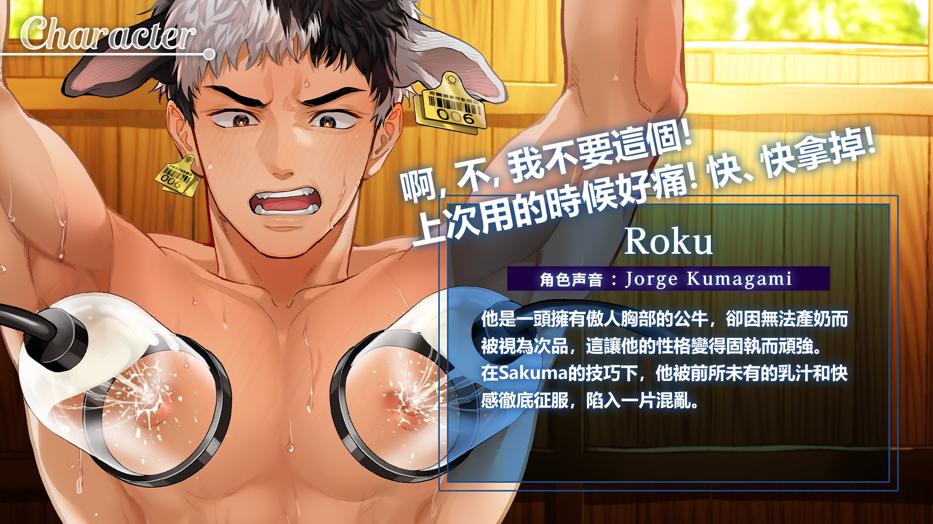 一位能讓難產奶的奶牛都產奶的擠奶顧問。Sakuma,這位在產奶難題上成為專家的顧問,與因無法泌乳而變得頑固的公牛 Roku,開始了情色訓練,探索各種技巧以開啟奶水的流動。這是 Sakuma(看似溫柔實則真正的技術專家)與 Roku(英俊、肌肉發達的公牛)之間意志和技術的碰撞,牛奶和精液會四處飛濺嗎?! Roku━━━━━━━━━他是一頭擁有傲人胸部的公牛,卻因無法產奶而被視為次品,這讓他的性格變得固執而頑強。在Sakuma的技巧下,他被前所未有的乳汁和快感徹底征服,陷入一片混亂。