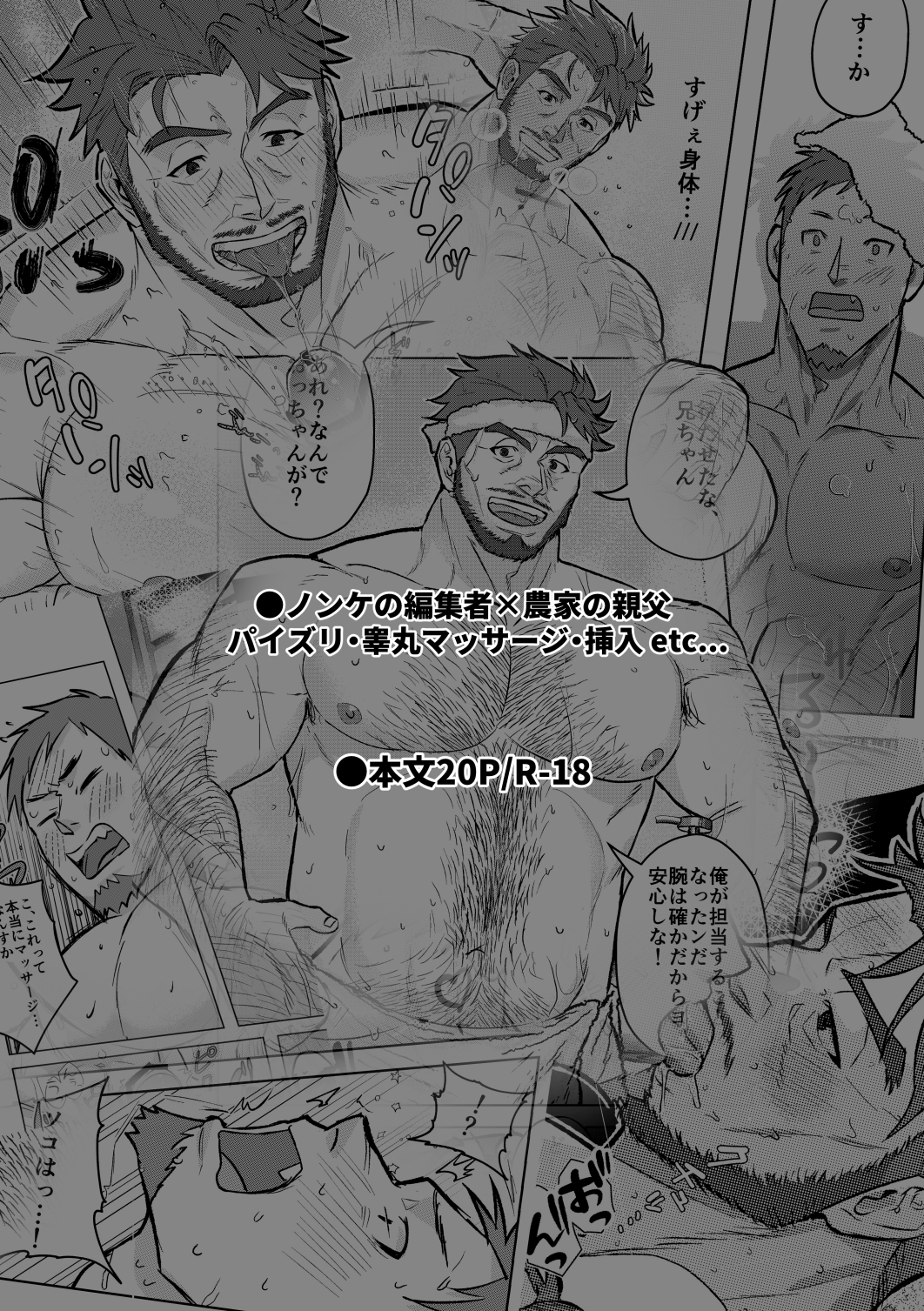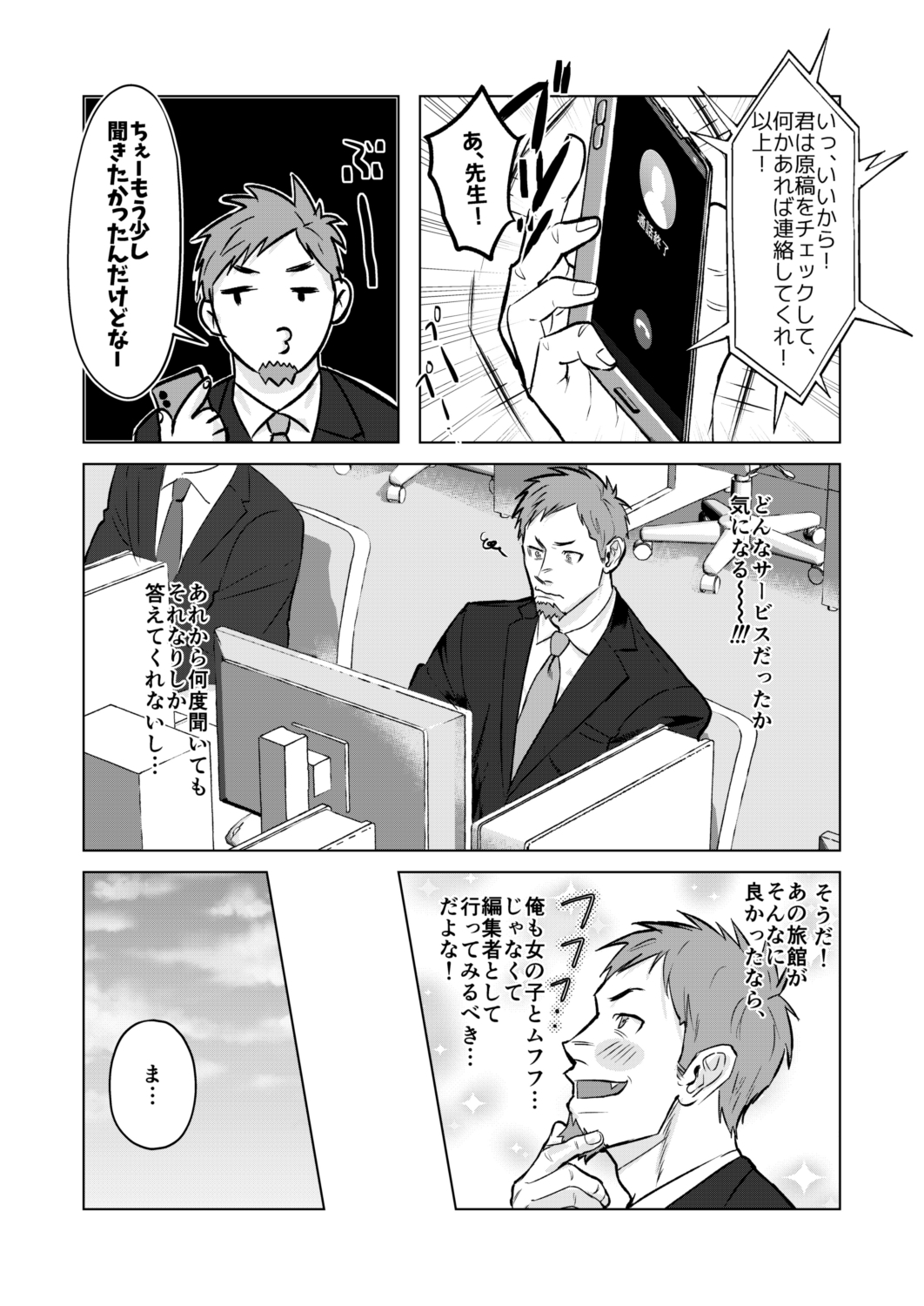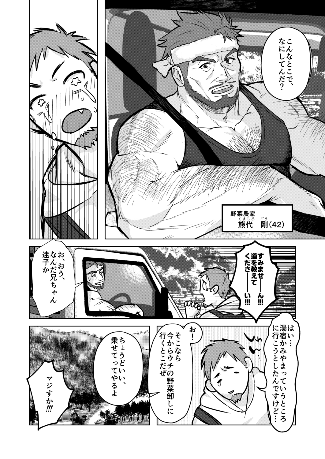 編集者の拓也(たくや)は、自身が手配した温泉旅館の裏サービスの詳細を官能小説家から聞き出せず、女の子によるサービスを期待して向かうが迷子に。農家のオヤジ剛(ごう)に助けられ、特別メニューを用意されるも、待っていたのは剛本人で、いっけん普通のマッサージかと思われたが…。