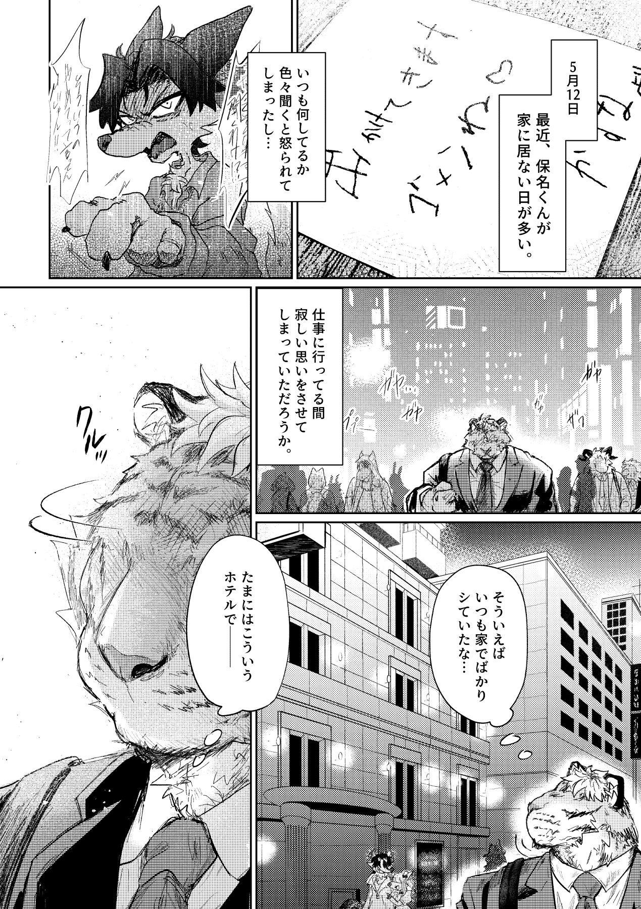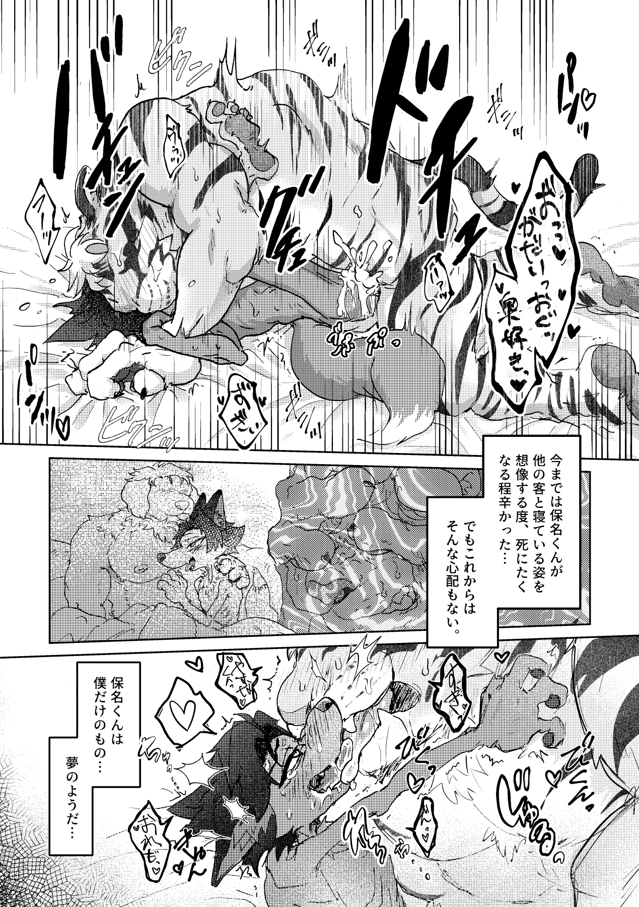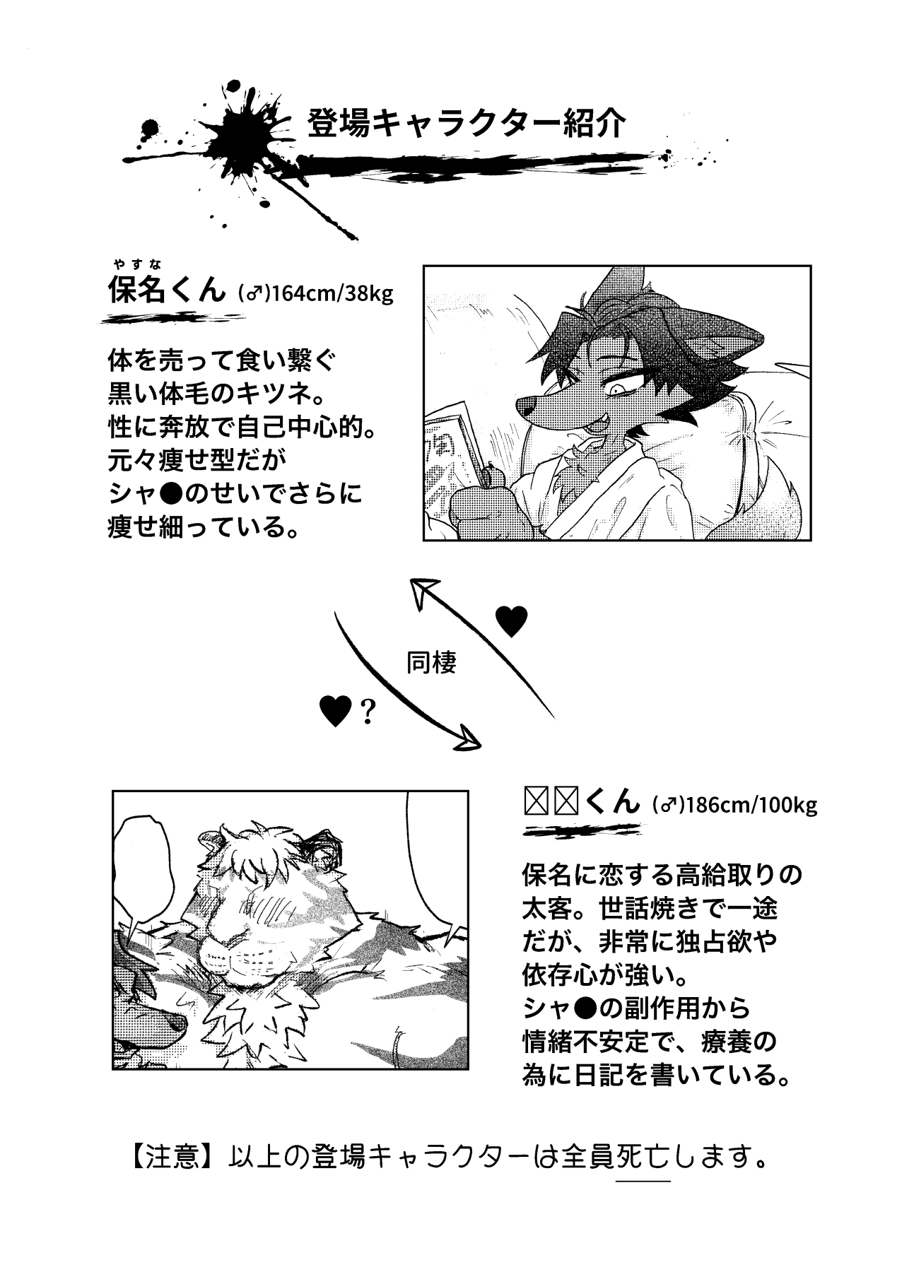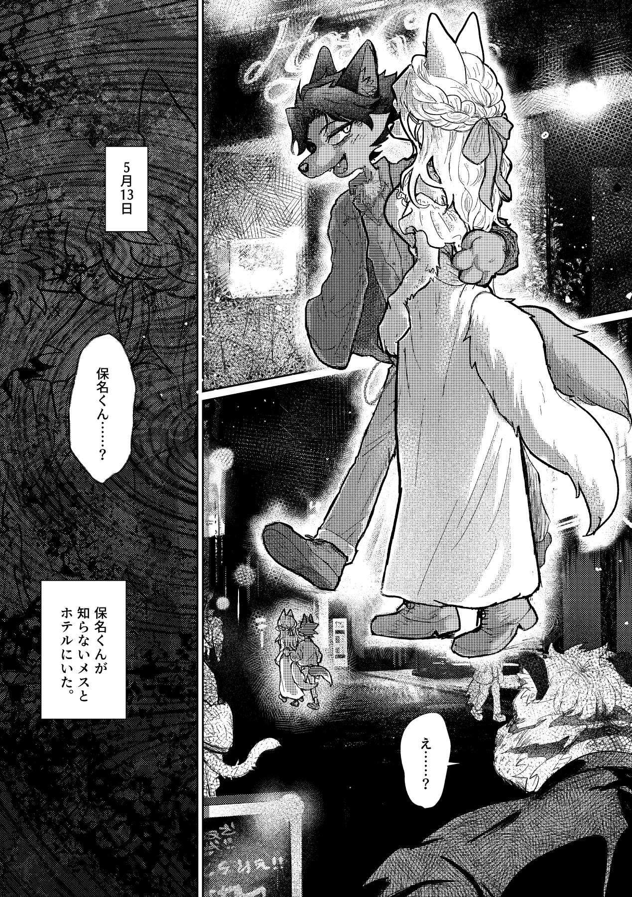 【あらすじ】キツネの男娼保名(やすな)に恋心を抱く太客××は、長年通いつめた末プロポーズし同棲を始める。だが数ヶ月後、保名は××に隠れて行きずりのメスと交尾をしていることが発覚。懲りずに浮気を重ねる保名に、××の精神は病み始め、感情のまま自室に保名を閉じ込め拘束。二匹だけの世界、快楽と狂気の日々が始まる…