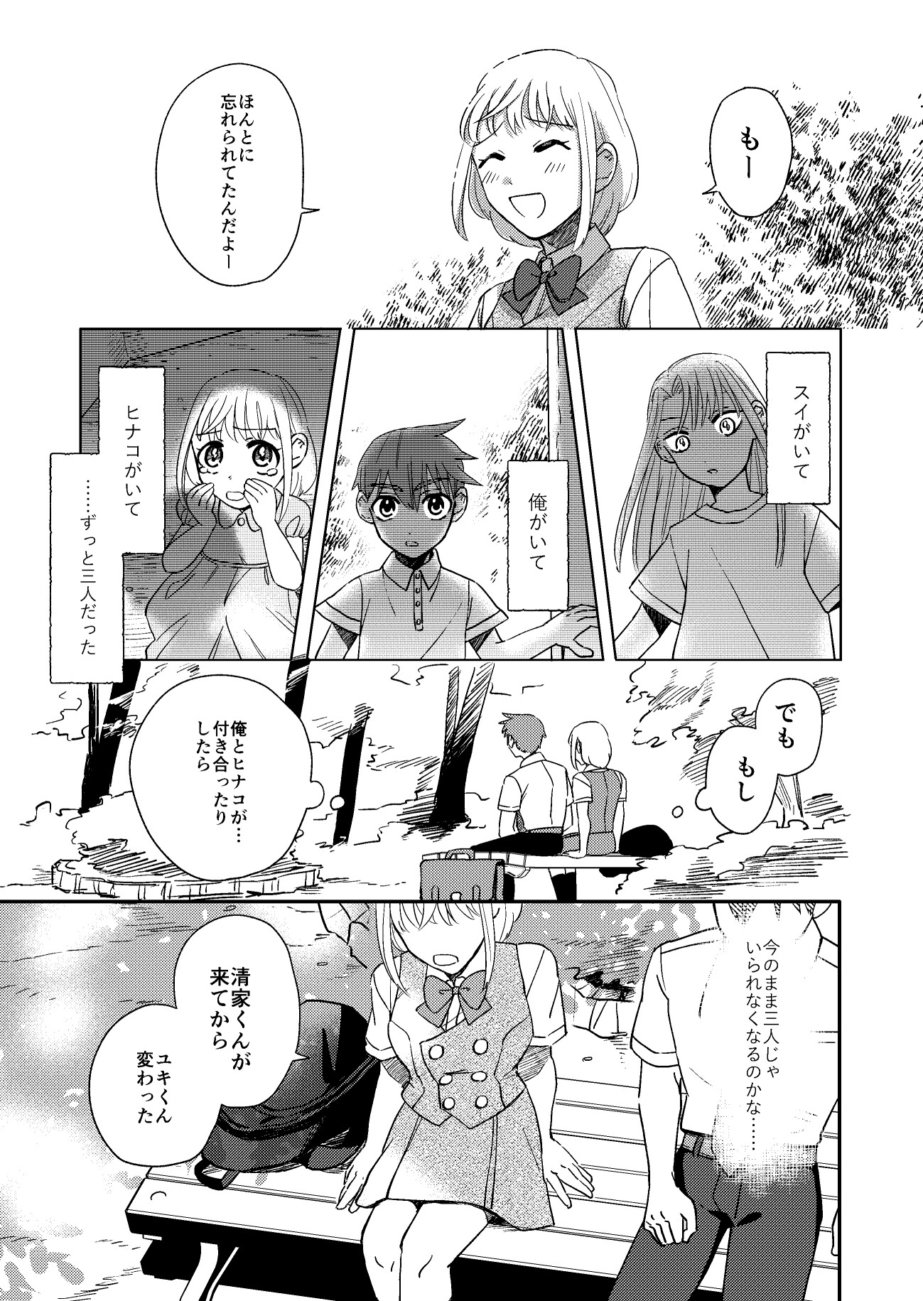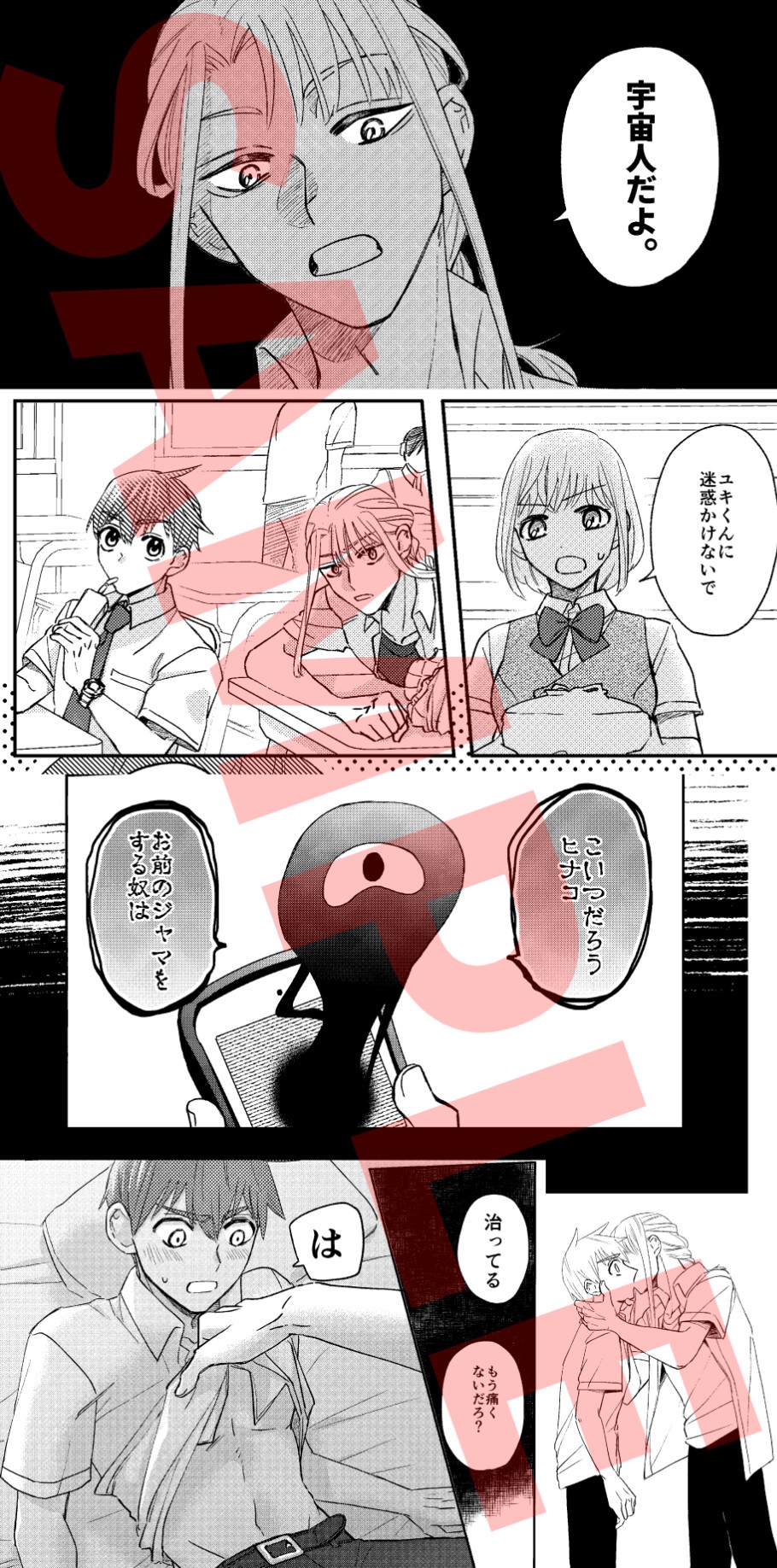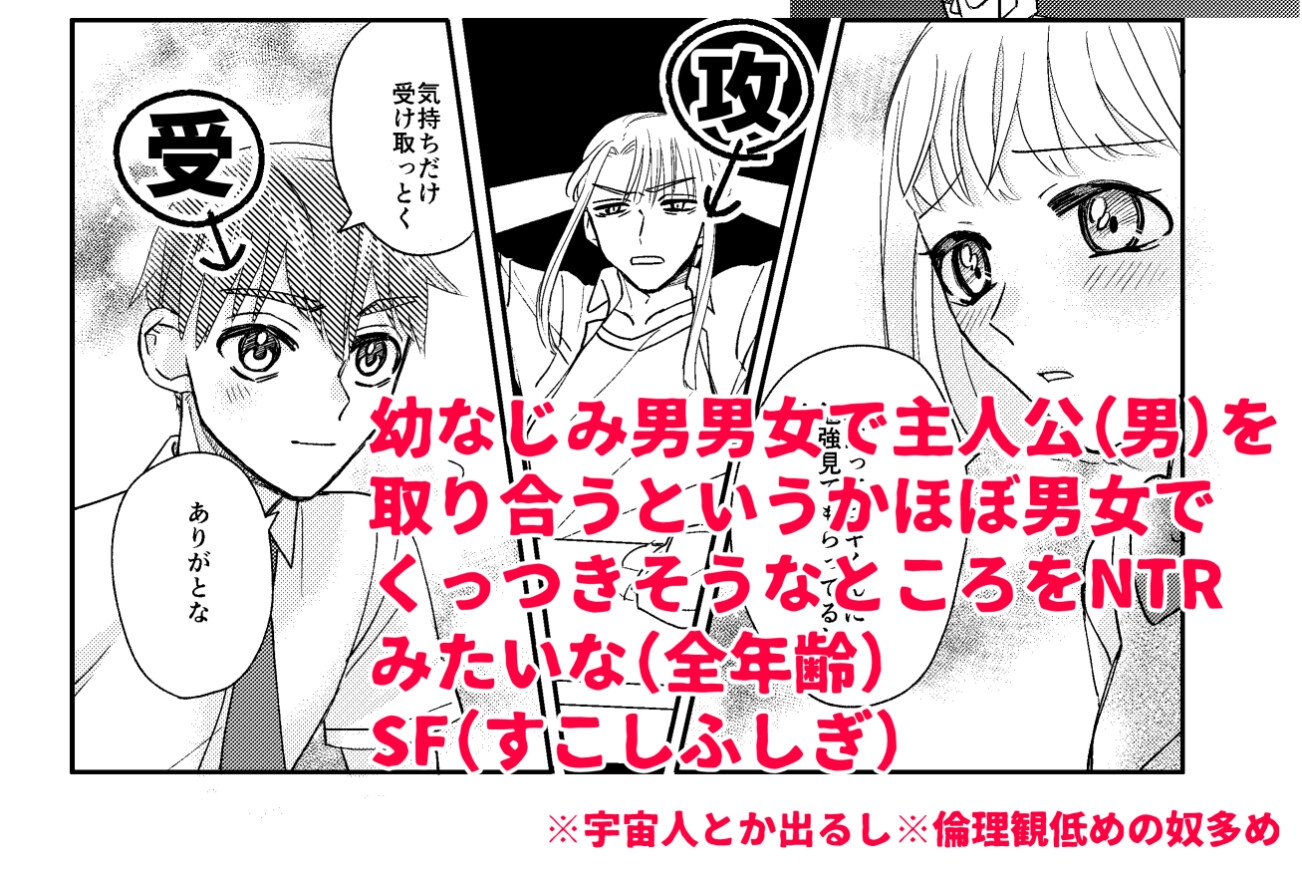幼なじみ三人で主人公(男)を取り合うというかほぼ男女がくっつきそうなところをNTRみたいな三角関係→BL。宇宙人とか出るタイプのSF(すこしふしぎ)。倫理観低めの奴多め、殺伐気味、洗脳とかはあるけど多分ホラーではない。糖度は爆低。