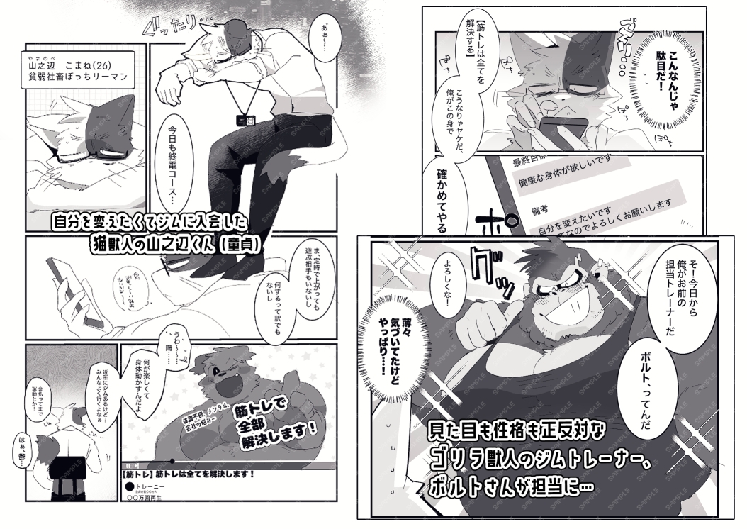 気弱根暗リーマンヒョロ猫獣人くん攻×快活屈強ジムトレーナーゴリラ獣人さん受の体格差筆下ろしエッチ本です