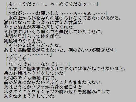 リネン系リースの会社で働く友坂憧一(24)と氷見野岳(34)は年の差10歳のコンビ。二人して各社を回る仕事をしていたが、ある夜黒塗りの車に乗り込んだ先輩、岳は翌日から無断欠勤。心配した憧一や社は彼に連絡を取ろうとするのだが叶わず仕舞。その頃岳は恋人兼飼主の砂山諭史の我が儘に無理やり付き合わされていた。