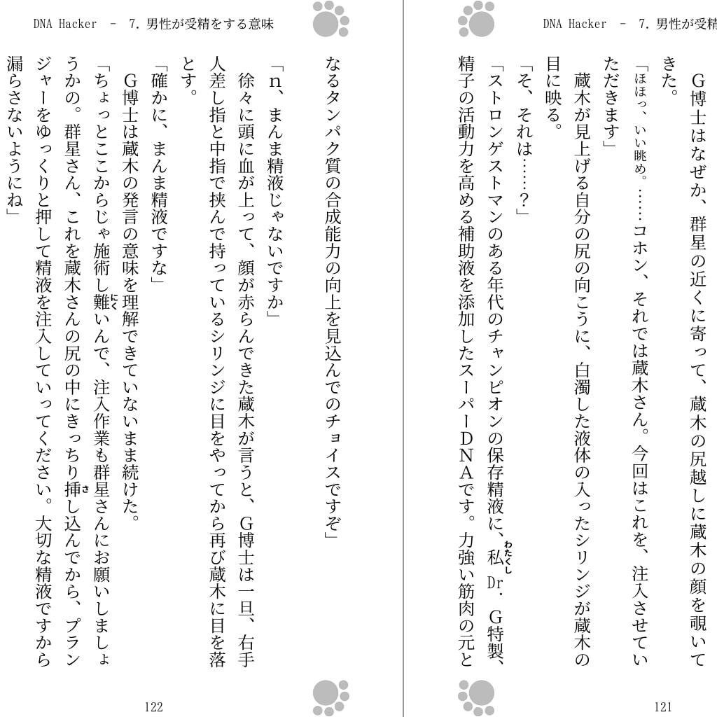 『テレゴニー』、『遺伝子の水平伝播』、『腸からの精液吸収』。これらの説や現象の組み合わせを具現化する蔵木は、変化してゆく己の身体に様々な不安と葛藤、そしてエロスも感じながら、男性が受精をする意味を大きく変化させ進化させた。そして、その具現化を群星と彼の精液が大きく後押しする。