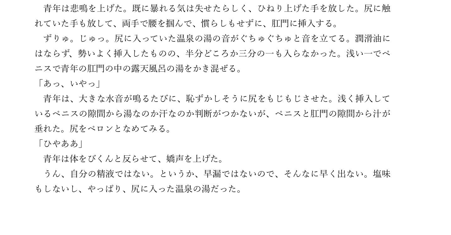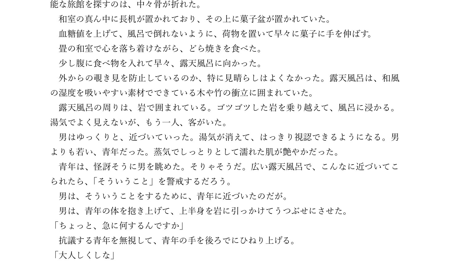 約5000字露天風呂・和室・旅行先異物・合意無し・中だし・浴衣旅行者攻めと旅行者受けがセックスします。