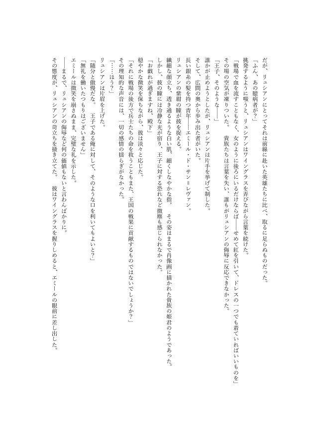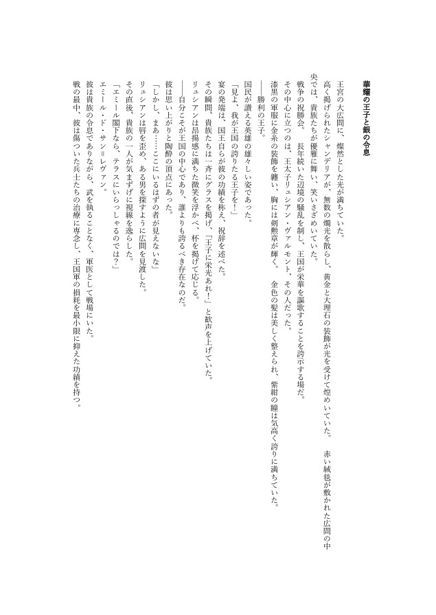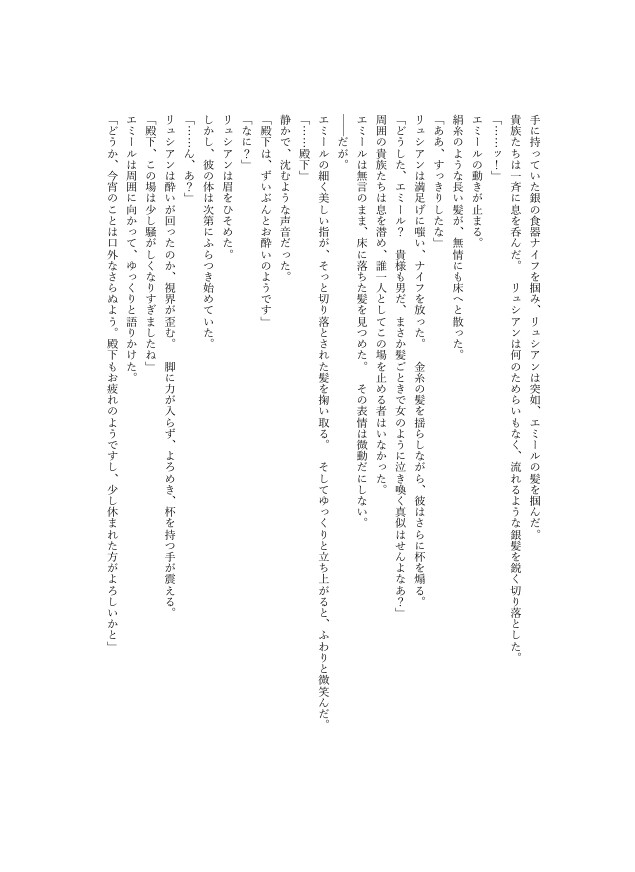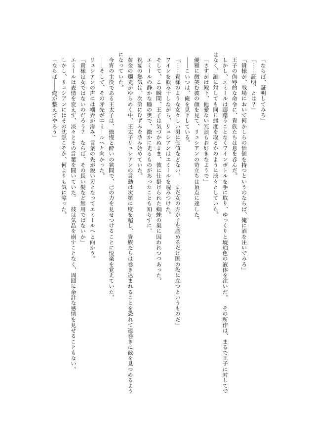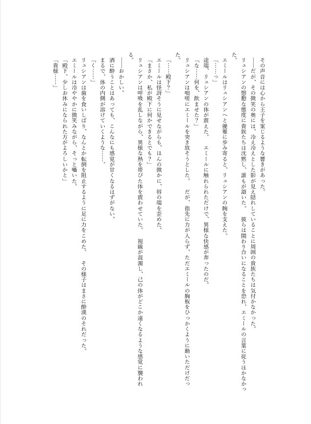 王子リュシアンは、戦争の英雄として称えられながらも、後方支援に徹した貴族の令息エミールを見下していた。宴の席で彼を侮辱し、長い銀髪を切り落とす。しかし、その直後、リュシアンの身体に異変が生じる。熱に浮かされるような感覚、快楽を伴う違和感――それはエミールの仕掛けた罠だった。静かに微笑むエミールの手によって、リュシアンは快楽と屈辱の狭間へと堕ちていく。王子としての誇りと男の矜持が試される中、次第に彼は逃れられぬ支配に絡め取られていく。己の立場が逆転したとき、リュシアンの運命はどこへ向かうのか?