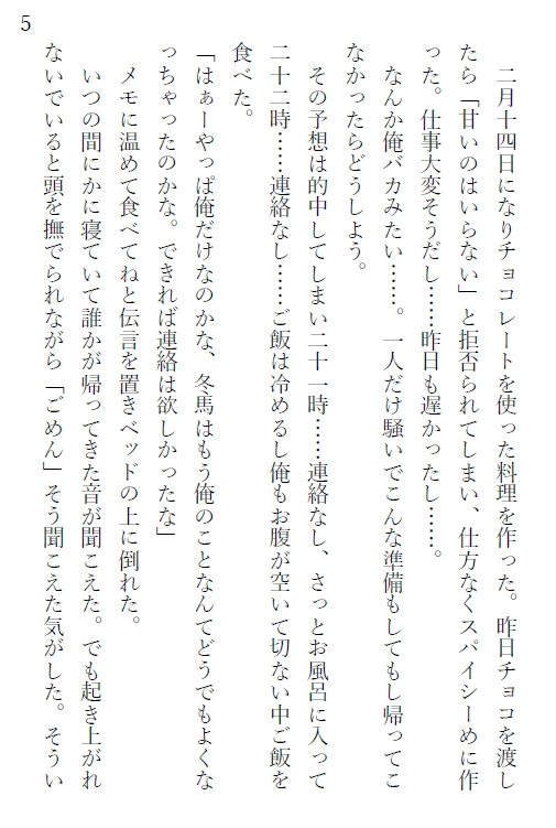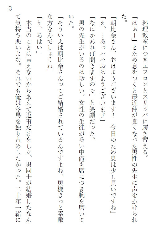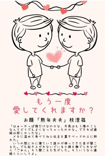 ❁あらすじ同性婚をし夫夫になった裕太と冬馬。毎日のように抱かれ毎日のように快楽に溺れていた夜を懐かしく感じてしまう。そして二十周年の夜それは突然的に起きた。「お祝い事よりも残業が大切?仕事優先なの?」でももう分かりきっていたのかも知れない。裕太は冬馬の心変わりに胸を痛めていた。だからマンネリ脱却のため「もう一度愛してくれますか?」と持ちかける。