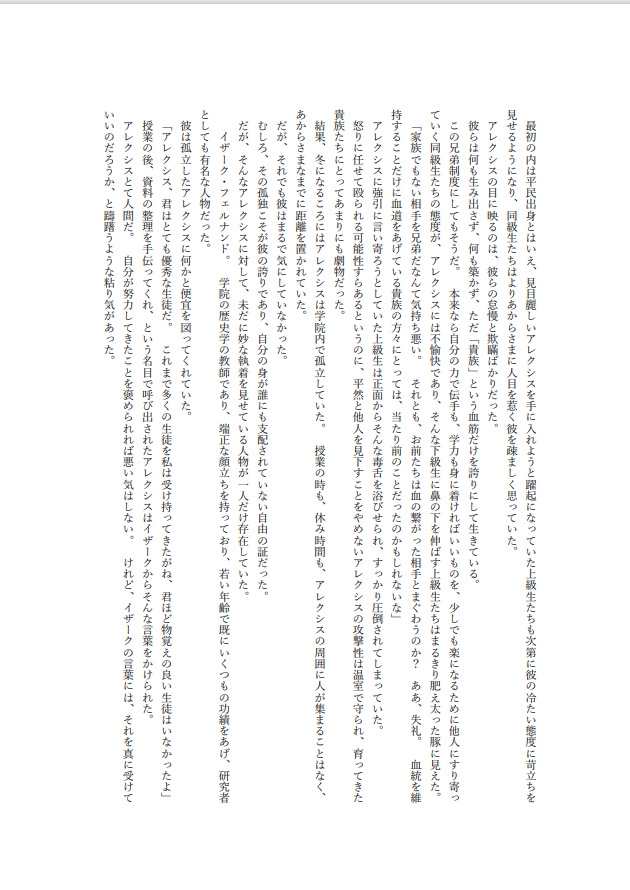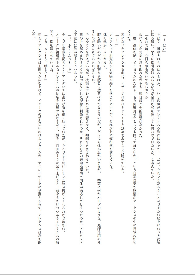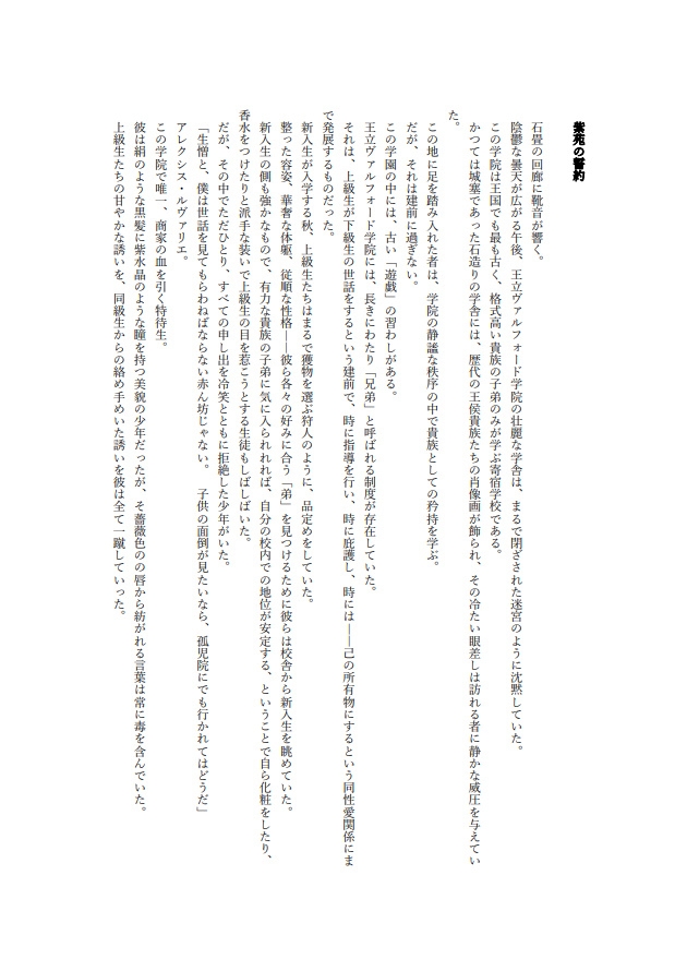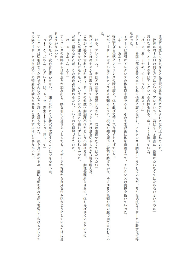 貴族のみが通う王立ヴァルフォード学院に、商家出身の特待生アレクシスが入学する。華やかな容姿と卓越した頭脳を持ちながらも、学院の異常な「兄弟制度」を拒み、彼は孤立を深めていく。しかし、歴史教師イザークは彼に特別な執着を抱き、ある事件をきっかけにアレクシスを指導寮へと追いやる。森の奥にひっそりと佇む指導寮。そこは問題児を閉じ込めるための場所であり、彼の部屋の鍵は外側からかけられる仕組みだった。――君は従順でなければならない。甘く囁くイザークの言葉に、アレクシスは抗おうとするが、次第に心と身体は絡め取られていく。果たして彼は自由を取り戻せるのか、それとも――。