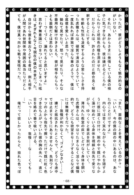 それでも友人達へ挿入させない理性が良き。ぼんやりした攻めが可愛いです。サークルさんの絵が可愛くまたシチュがとても好みで、この作品の前作の作品が前々から気になっていた。今後が楽しみです。ヤラれてもなお堕ちない主人公にますます煽られるカレ。意外にも今回はめずらしく獣人ものでさらにおじさん受け。