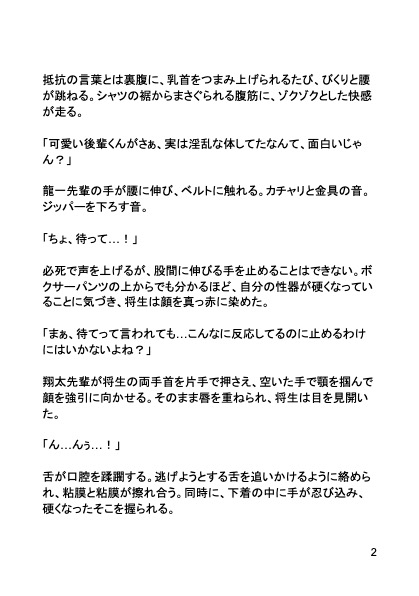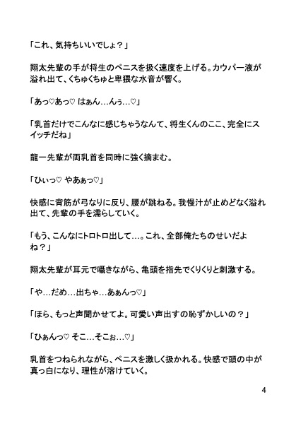 【あらすじ】大学に入学したばかりの新入生・将生。参加したサークルの歓迎会で酔って潰れた夜、イケメン先輩二人にアナルの快感を教え込まれてしまう。翔太先輩の執拗な乳首責めと、龍一先輩の巧みなアナル開発で、童貞なのにメス堕ちしてしまう将生。居酒屋の個室という場所にも関わらず、声を抑えきれないほどの快感に溺れ…。大学デビューで女の子とエッチすることを夢見ていた童貞くんが、二人の先輩専用のメス穴へと調教されていく…!