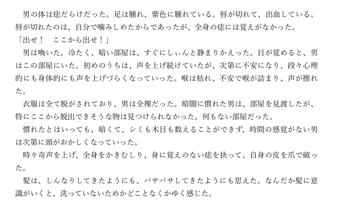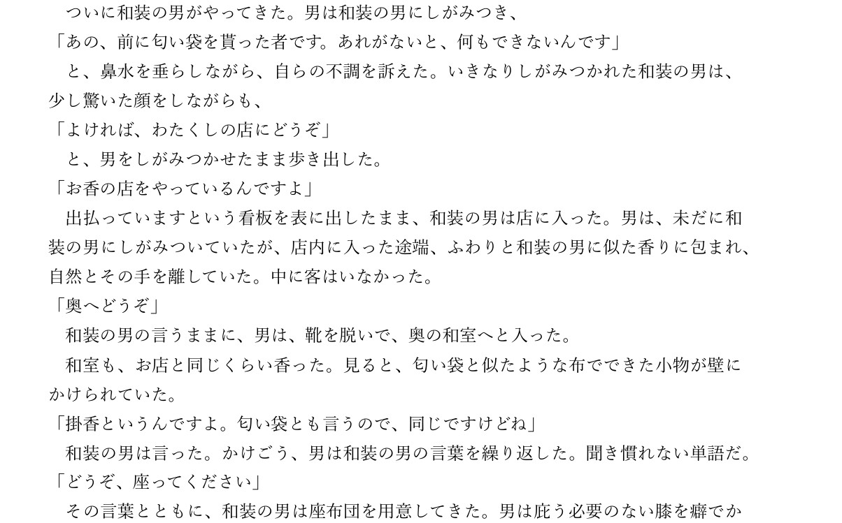 約5100字昔のあることがきっかけで、光や暗闇、昔の古傷に過敏になってしまった元スポーツ選手が、あるとき調香師とすれ違い、その香りに惹かれる。 この物語はフィクションです。登場する人物名、地名、名称等は現実のものとは関係ありません。
