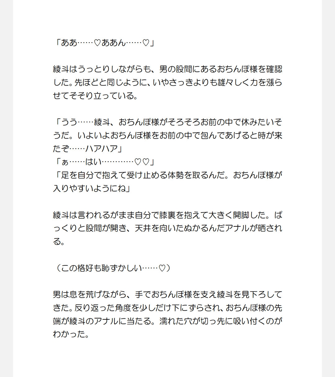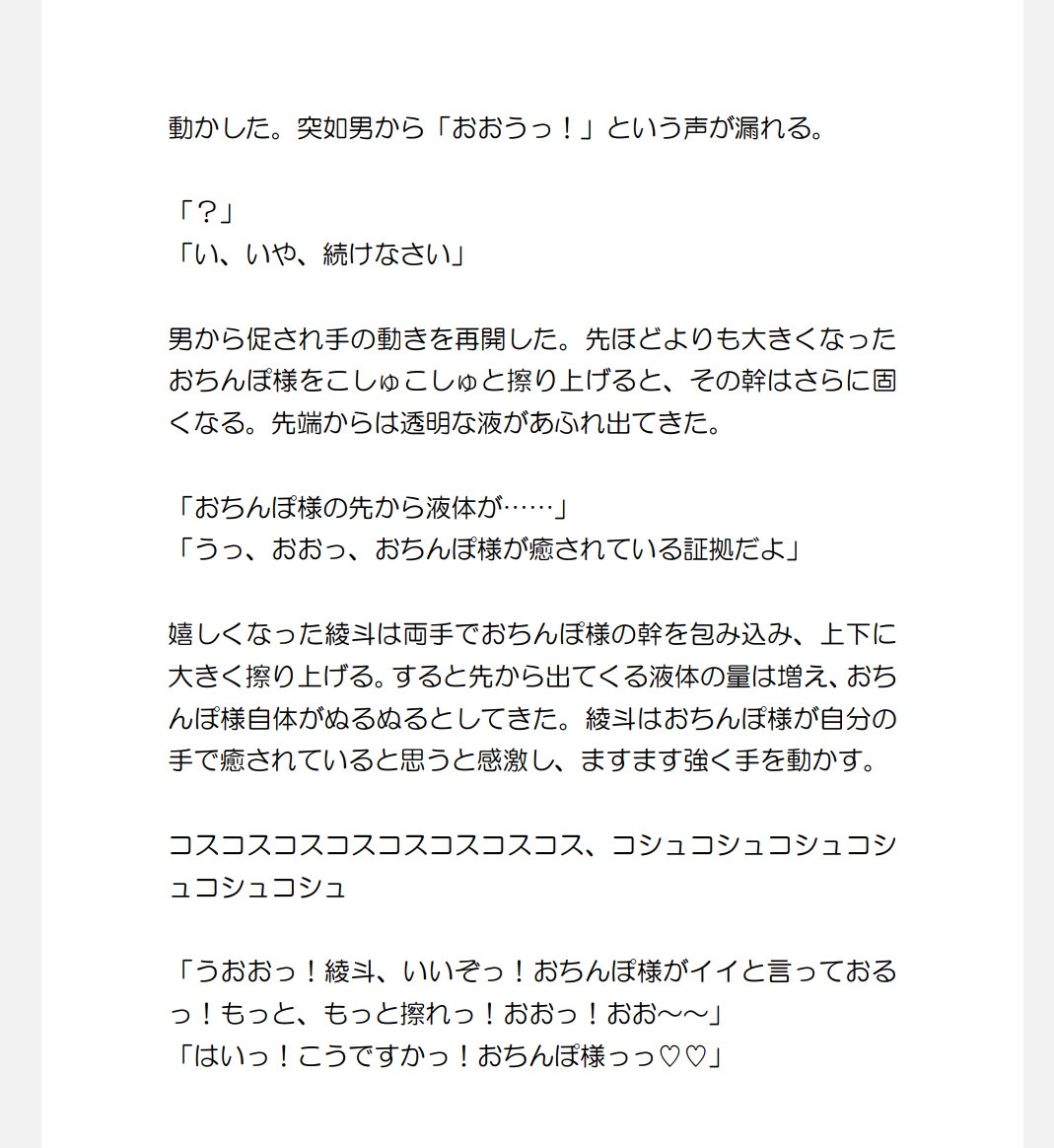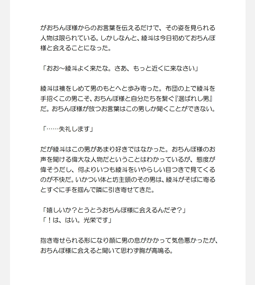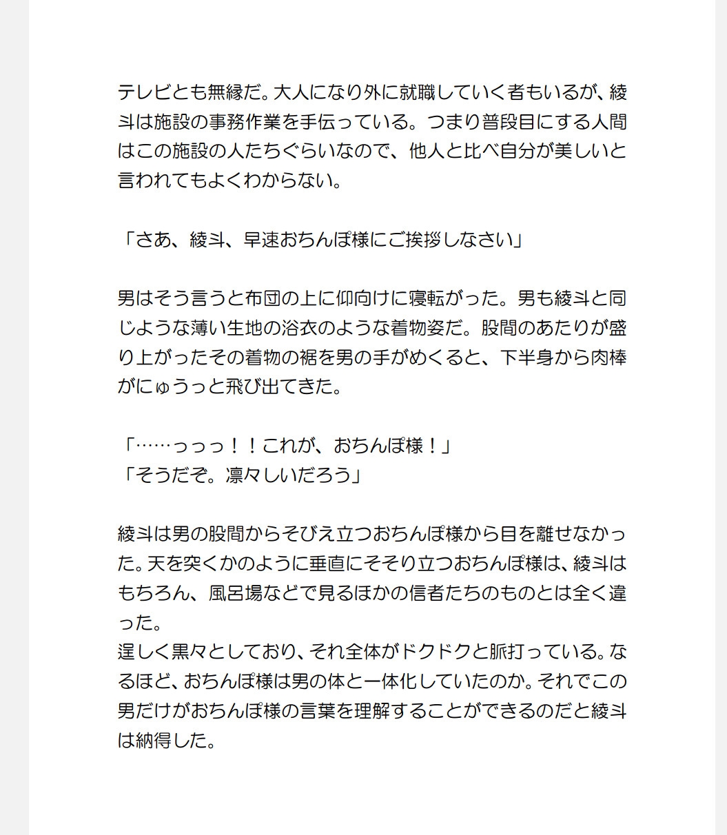 おちんぽ教という宗教の信者である美青年・綾斗は、神とされる『おちんぽ様』の世話係に抜擢される。教祖であるスケベおっさんに言われるがまま男のおちんぽの奉仕をすることになるが……おっさんのちんぽを神様だと信じ込んだ純粋な美青年がフェラしたりアナルにちんぽを迎え入れたりするエロです。