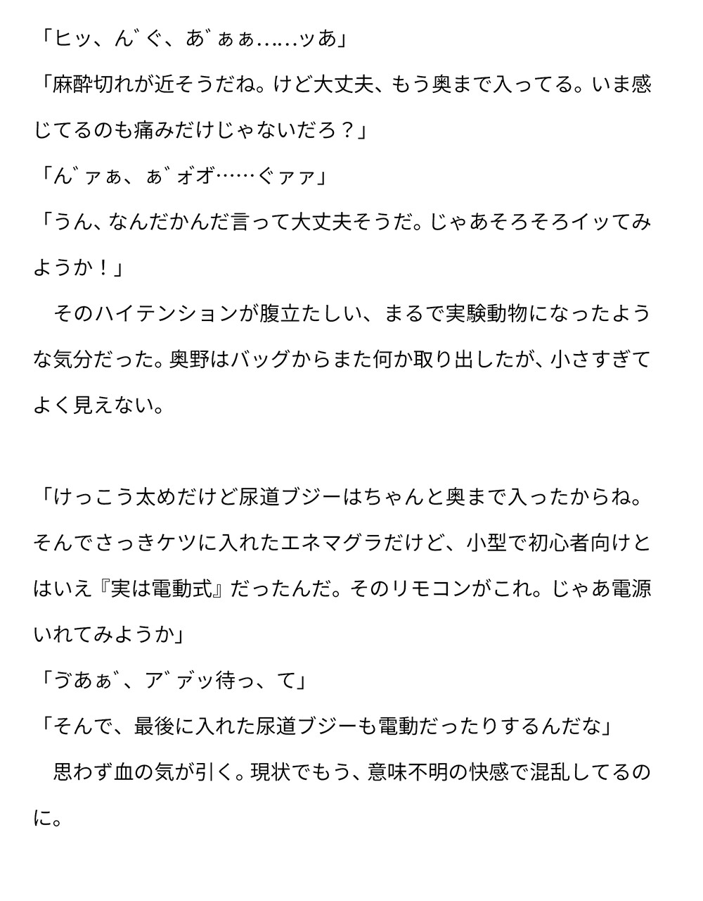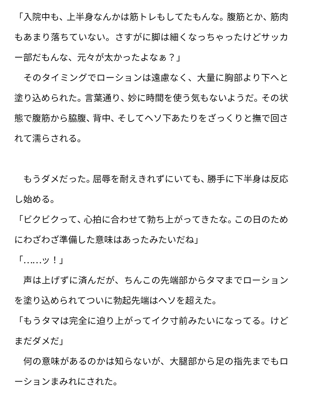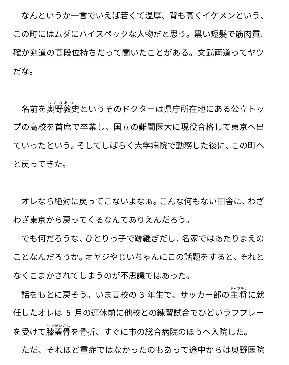 奥野敦史(おくのあつし)奥野医院の若先生と呼ばれる。先代は強面で威厳があった。こちらは明るいイケメンとして親しまれているが……髪は黒で短め。 町の診療所についてのウワサ話。 夜の見回りで担当医が見せ始めた本性。 退院を控えて浮かれている透は、すでに奥野の術中に落ちていた。 奥野の本性が牙を剥く。最終章。