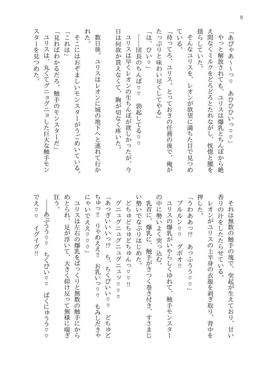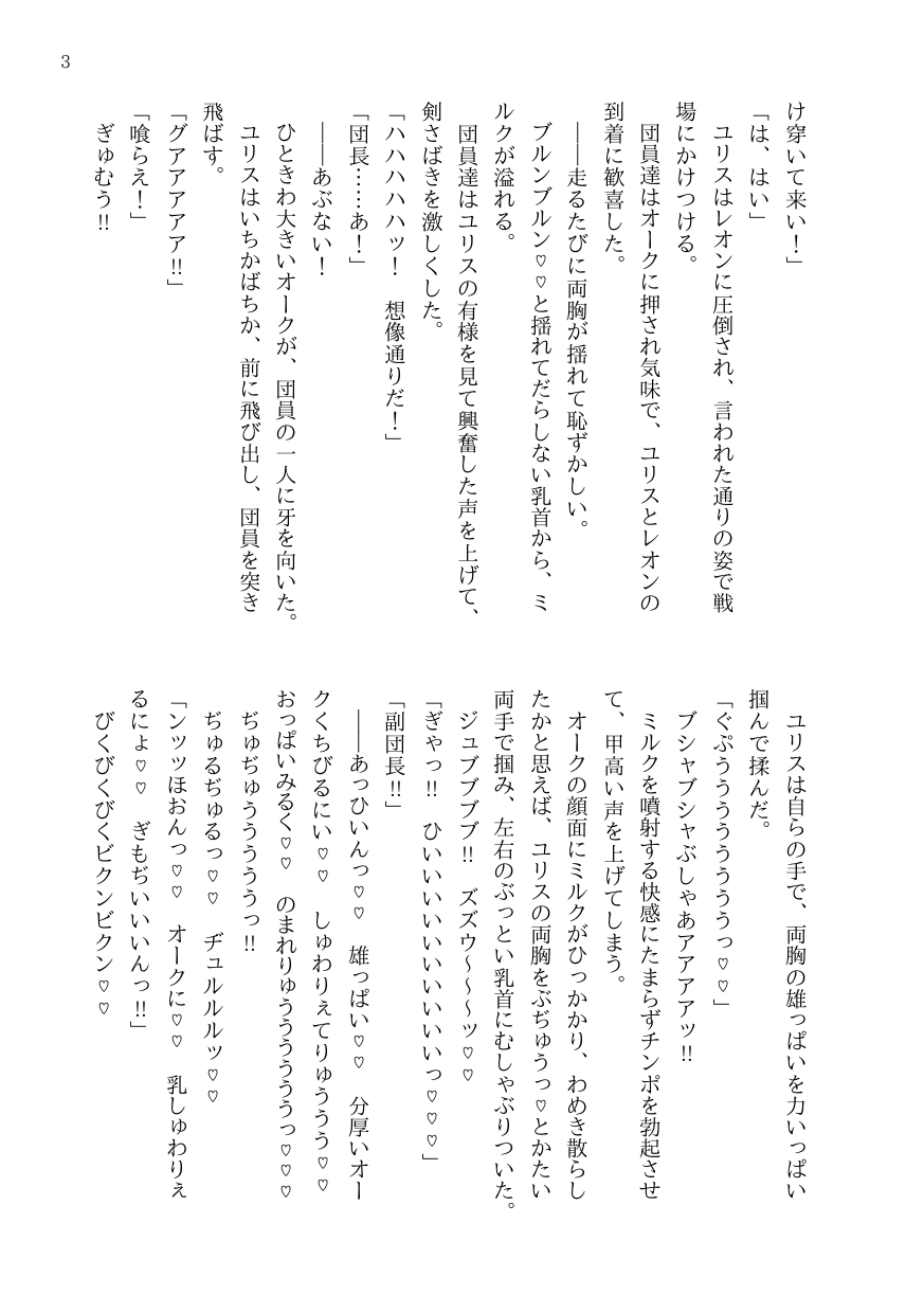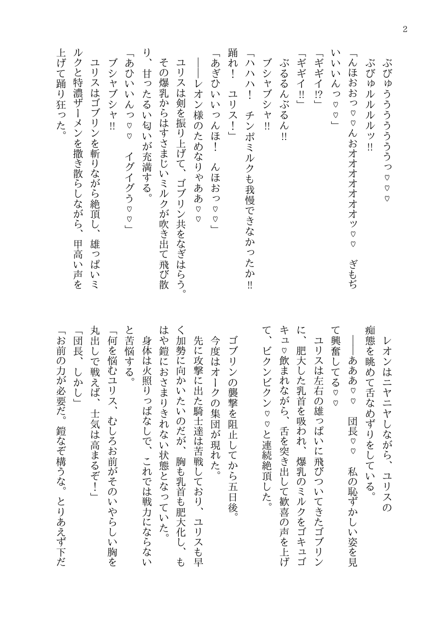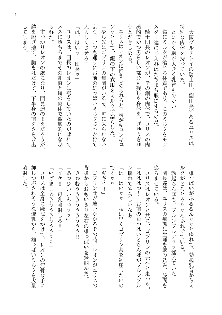 大国グルストイの騎士団、副団長であるユリスは、特別な肉体を持っていた。とにかく胸が大きく乳首もでかい。常にミルクが溢れる体質であり、このミルクをモンスター達に与えればたちまち服従するのだ。ゴブリン、オーク、触手モンスター、愛する団長のレオンにまで、雄っぱいミルクを飲まれ、肥大化乳首を弄くり回され、チンポミルクを飲まれ、えろえろな肉体をなぶりつくされる♡♡WEB掲載作品。雄っぱいミルク乳首責め前立腺責め中出し異種姦騎士団員達との乱交放尿触手姦触手丸呑み出産