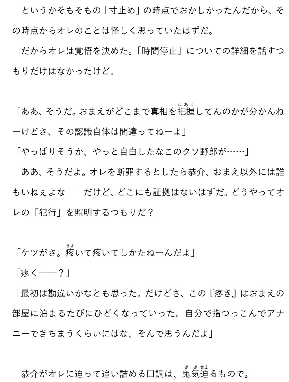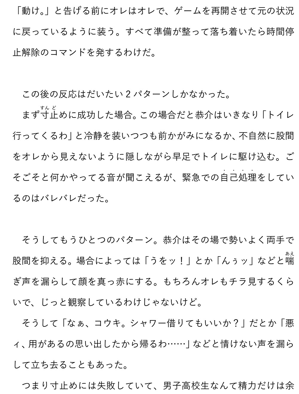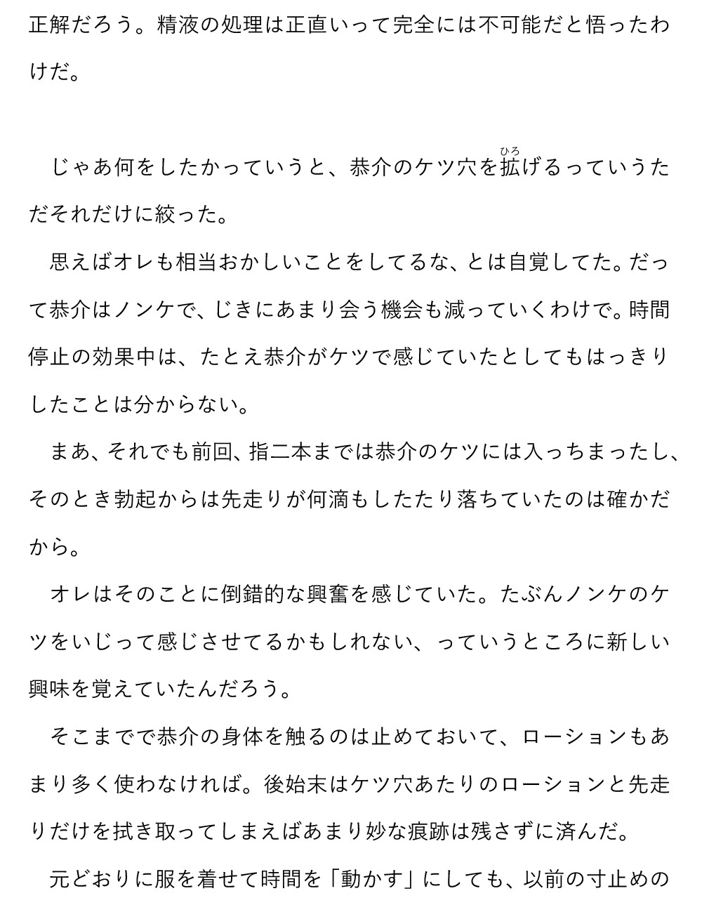 子どものころから不思議な能力があった。時間停止──ただし制限だらけで、そんな便利なモノでもないと知っている。ターゲットにできるのはひとりだけ。タイムリミットは5分間。オレはこの能力を隠すことにしていた。制限つきの能力でも軍事、犯罪など応用すれば危ないことが出来てしまう、こんな能力があるなんてバレるとヤバいって知ってたから。幼馴染の恭介はどう見てもノンケで、オレの好きなヤツだけど、もうどうしようもない。卒業がせまっていた。時間停止を使ってオレは恭介を裸にしたり、勃たせて寸止めにしたりとロクでもないことをしていた。そんな中、オレの能力は意外な変化をし始めるのだが……。※横書きのゴシックフォント版と、縦書きの明朝フォント版が入っています。※本文は17000文字ほどです(濁点など含む) 広沢 洸稀(ヒロサワ コウキ):とある私立大学の附属高校3年生。髪型は黒のショートウルフ。元陸上部。隠れゲイだが、女子にはモテるほう。