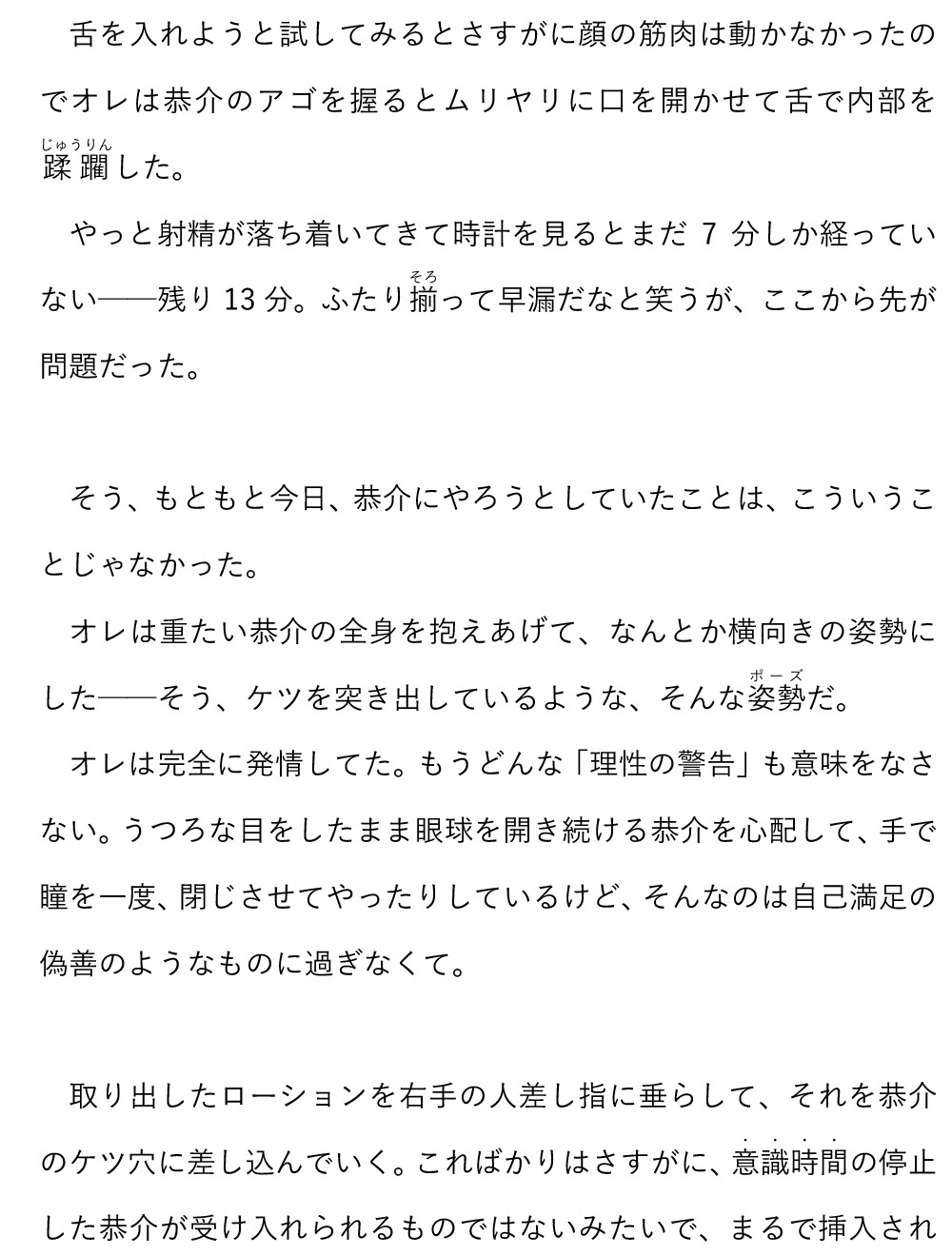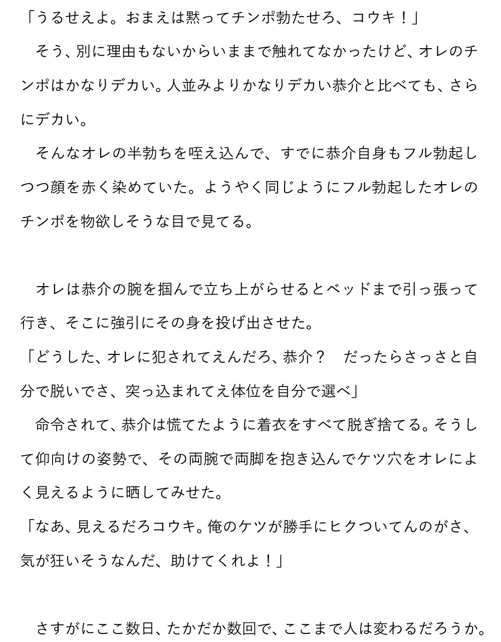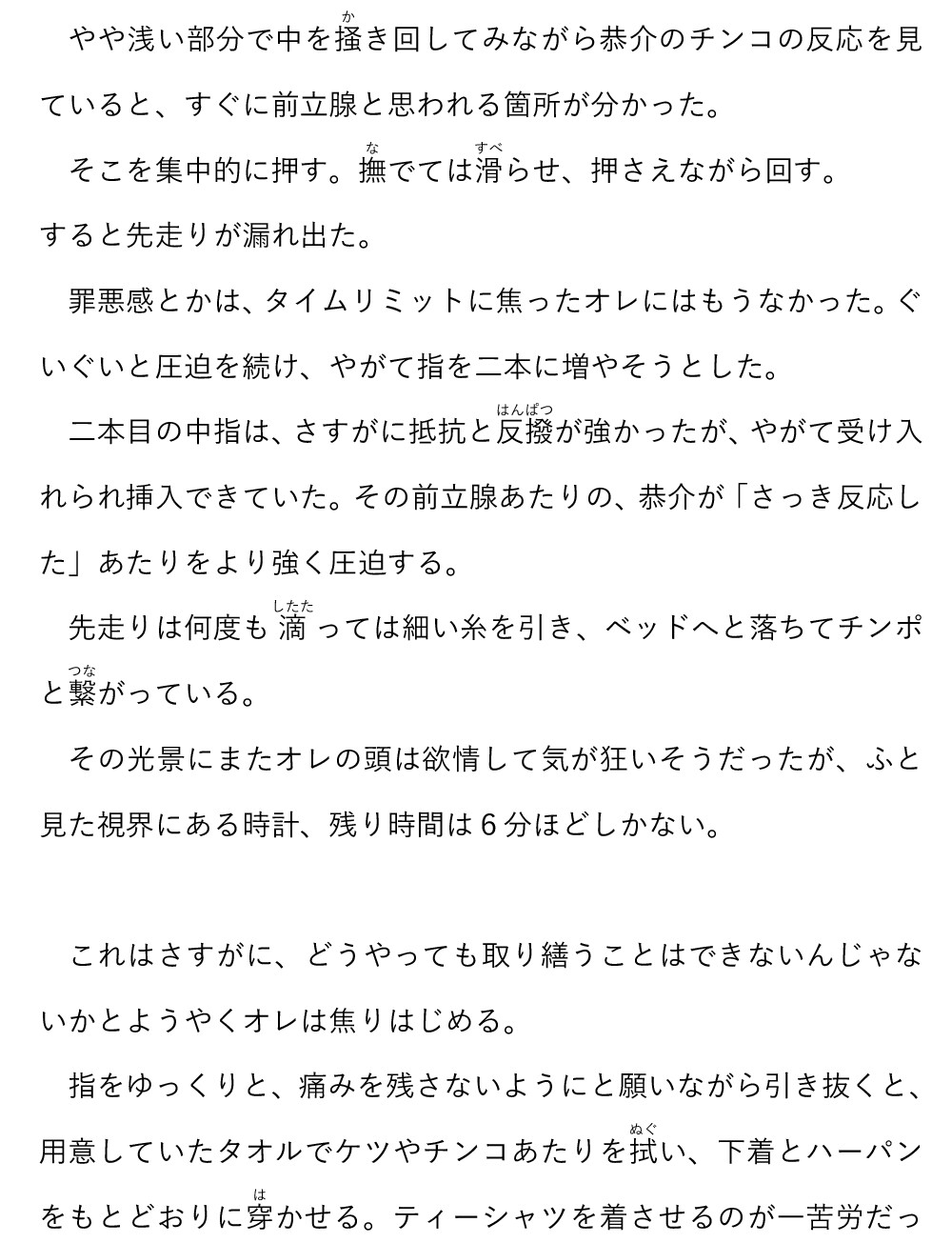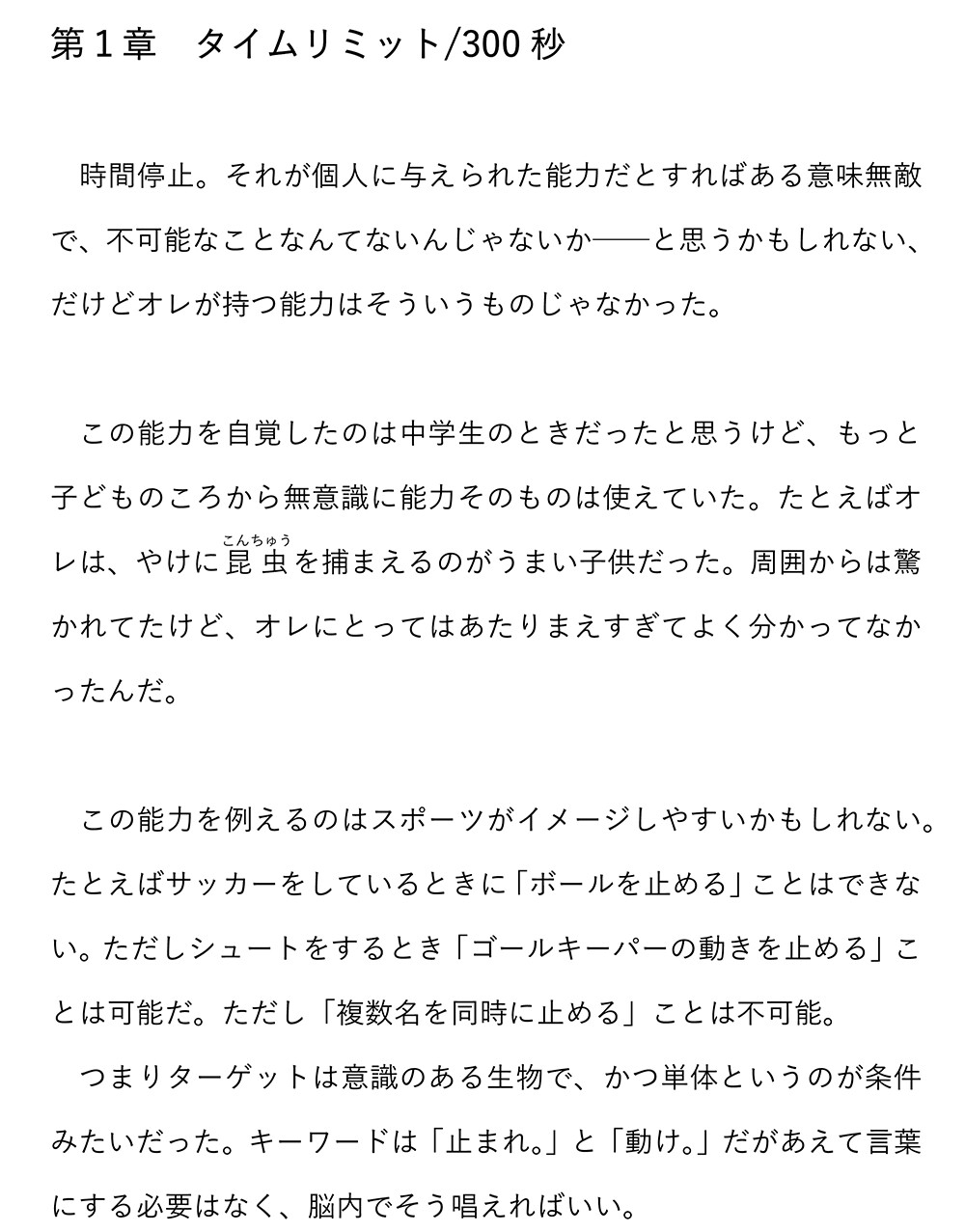 子どものころから不思議な能力があった。時間停止──ただし制限だらけで、そんな便利なモノでもないと知っている。ターゲットにできるのはひとりだけ。タイムリミットは5分間。オレはこの能力を隠すことにしていた。制限つきの能力でも軍事、犯罪など応用すれば危ないことが出来てしまう、こんな能力があるなんてバレるとヤバいって知ってたから。幼馴染の恭介はどう見てもノンケで、オレの好きなヤツだけど、もうどうしようもない。卒業がせまっていた。時間停止を使ってオレは恭介を裸にしたり、勃たせて寸止めにしたりとロクでもないことをしていた。そんな中、オレの能力は意外な変化をし始めるのだが……。※横書きのゴシックフォント版と、縦書きの明朝フォント版が入っています。※本文は17000文字ほどです(濁点など含む) 広沢 洸稀(ヒロサワ コウキ):とある私立大学の附属高校3年生。髪型は黒のショートウルフ。元陸上部。隠れゲイだが、女子にはモテるほう。