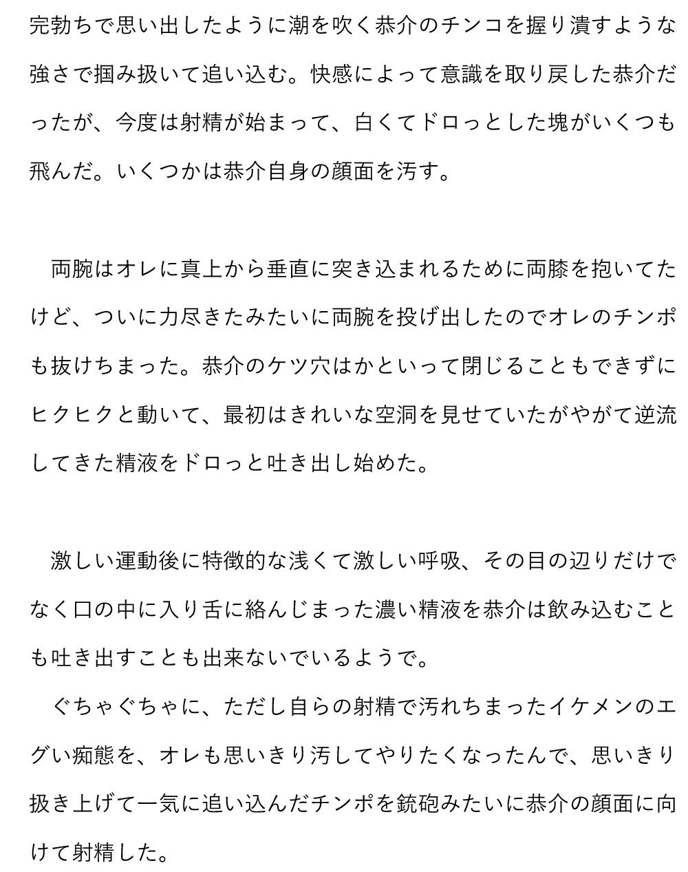 顔のいい男が糞をするっていうのは良いギャップがあって好き。「念願の押し入れで初エッチ!」を成功させるべくウキウキしながらも頑張るいじらしさがかわいいです!無理矢理とはいえ、両想いなので可哀想さは薄れます。変態的な男から情報を得るためにあえて自分を抱かせるという作戦に出た主人公が、まんまとガンガンに抱かれて、結腸まで犯され、尿道まで攻められてしまうところはエロいです。