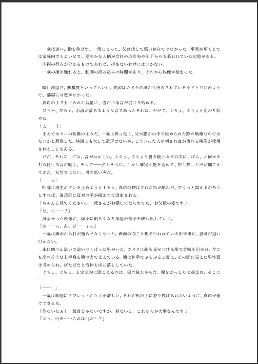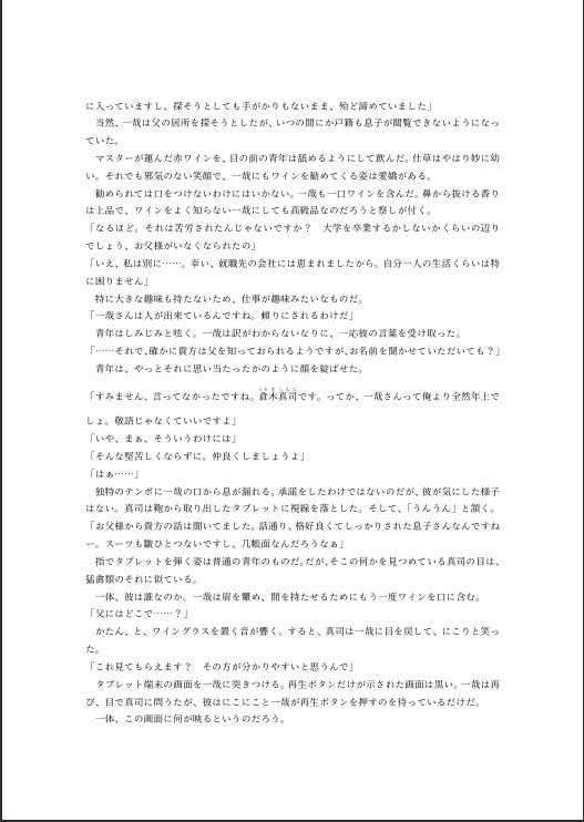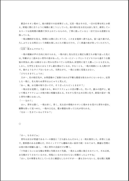 突如失踪した父を知る青年に声を掛けられた、元宮一哉は青年の誘いに乗ってバーに行く。