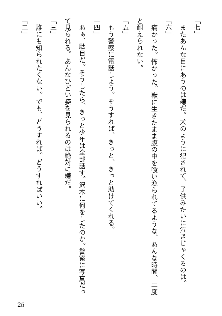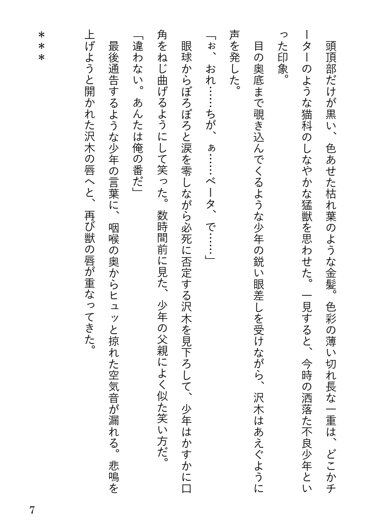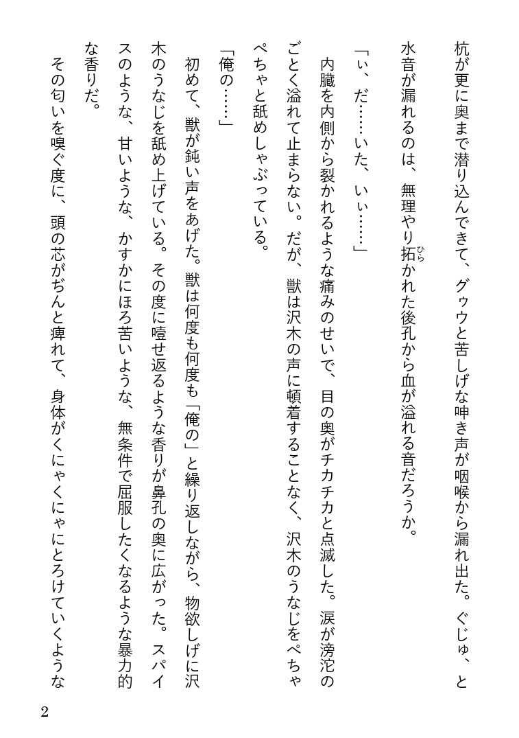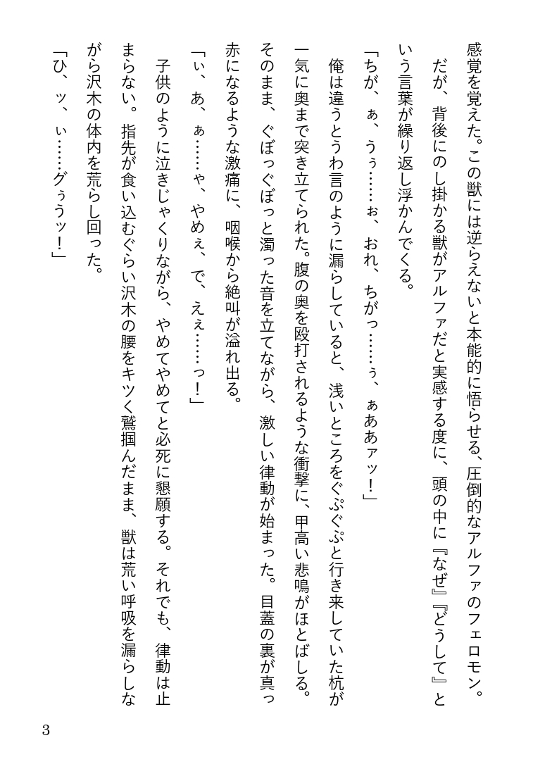 ベータとして平凡な人生を生きてきた沢木誠一。お得意先である九条家に、上司の付き添いとして訪問した沢木は、突然、九条家の次男である少年に犯され、Ωへと変異させられる。九条瑞樹と名乗った少年は、沢木の平穏だった生活を土足で踏み荒らし、あんたは俺の番だと言ってくる。沢木は少年に怯え、拒絶するが、次第に少年の不器用で一途な献身に気付き、複雑な感情を抱き始める。